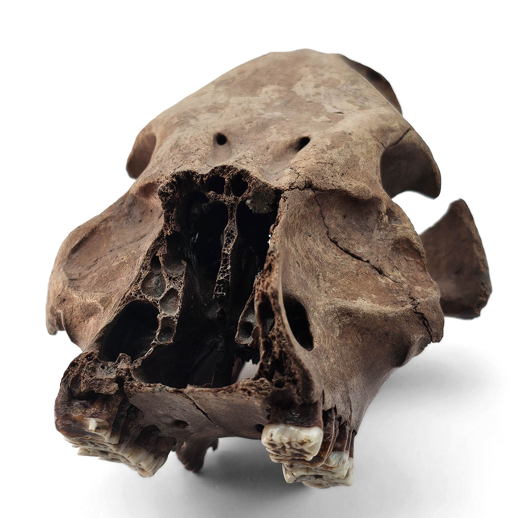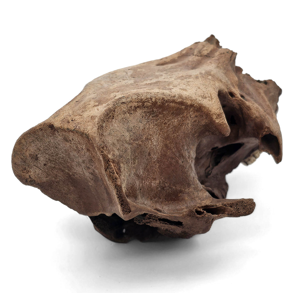 Description: This one-of-a-kind fossilized boar skull presents a solid, weighty structure with a broad cranial dome and pronounced zygomatic arches, characteristic of wild suids adapted for rooting and forceful jaw movement. The surface shows a natural range of preservation, with darker mineralization along the denser bone and lighter, weathered areas across the top of the cranium. The nasal region is partially eroded, exposing internal sinus cavities and giving a clear look at the internal bone architecture. The rear of the skull remains thick and intact, while the anterior portion shows natural breakage consistent with burial pressure and long-term geological processes.