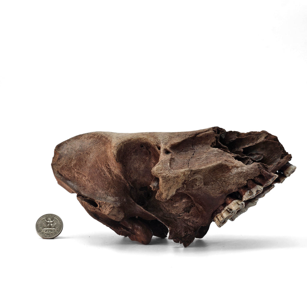 The dentition is a standout feature, with well-preserved molars still seated in the jaw. These teeth display the classic bunodont structure of omnivorous mammals, with rounded cusps designed for crushing and grinding. The enamel remains intact and contrasts sharply against the darker fossilized bone. Subtle cracking and stabilization lines across the skull reflect both age and fossilization conditions, likely from sediment compression and mineral replacement over time. This specimen would have formed in sedimentary environments where rapid burial and low oxygen conditions slowed decomposition and allowed mineral-rich groundwater to gradually replace organic material.