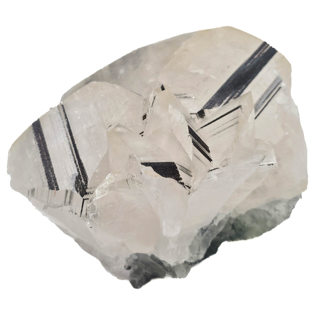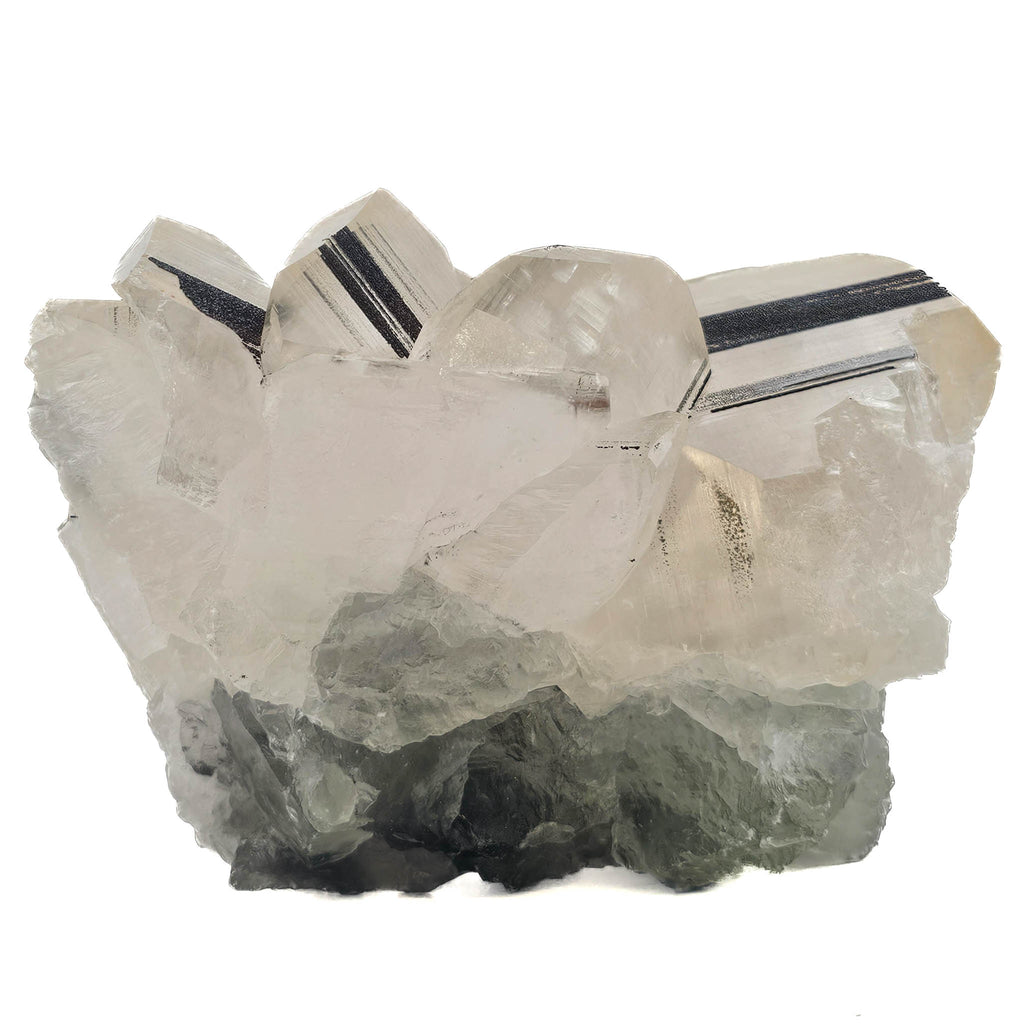 Description: This specimen is a tight cluster of tabular calcite crystals, arranged in overlapping, angular growth that gives the piece a compact but highly dimensional look. The crystals are clear to slightly milky, with broad, flat faces that catch light in a soft, glassy way. Running through many of these faces are bold, dark linear bands that cut cleanly across the crystal planes, creating a strong contrast against the pale calcite and emphasizing the geometry of the growth.