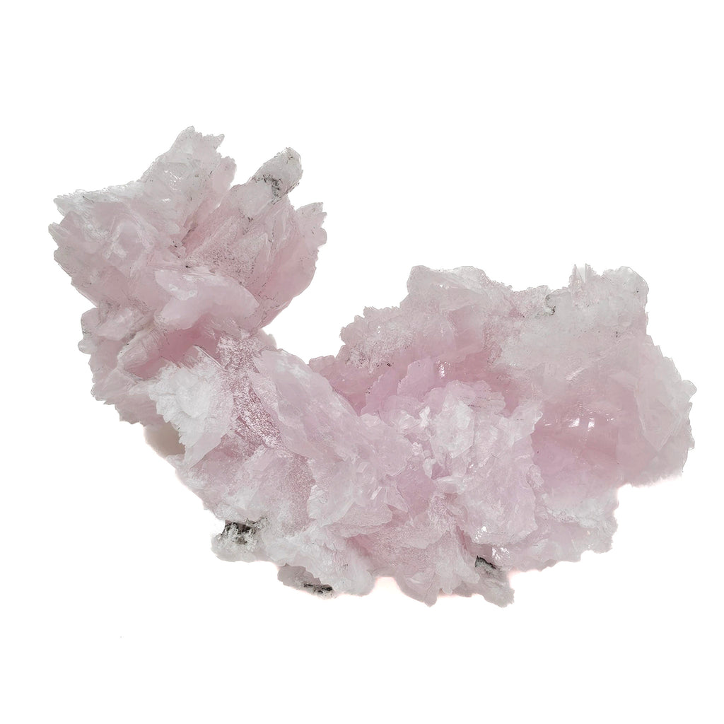 Description: This piece is a soft pink calcite showing a dense cluster of bladed crystals arranged in a rosette-like formation. The crystals are thin, slightly curved, and stacked in layered growth, giving the whole piece a textured, almost floral appearance. The pink color is consistent throughout the interior, with lighter edges and some white calcite overgrowths. There are also small dark inclusions scattered through parts of the piece, along with a few contrasting white, elongated secondary crystals adding depth and variation.