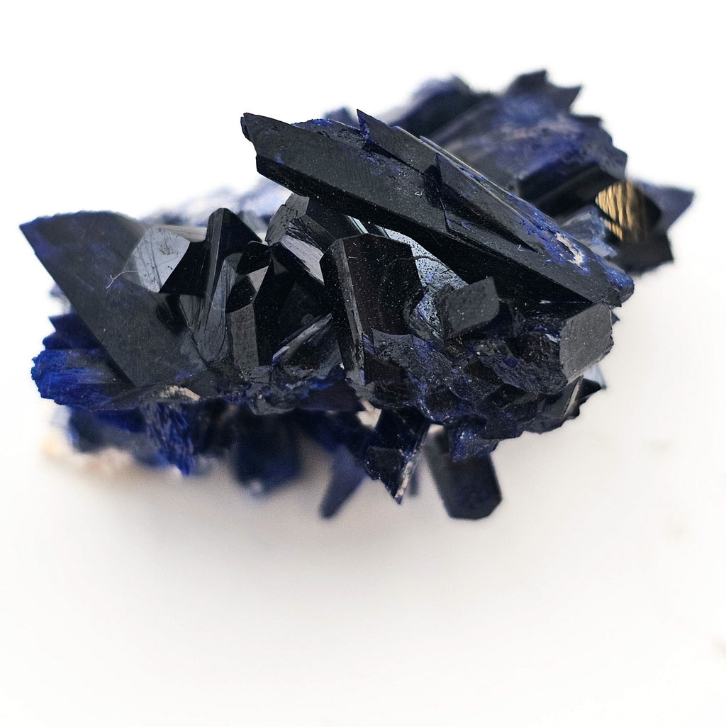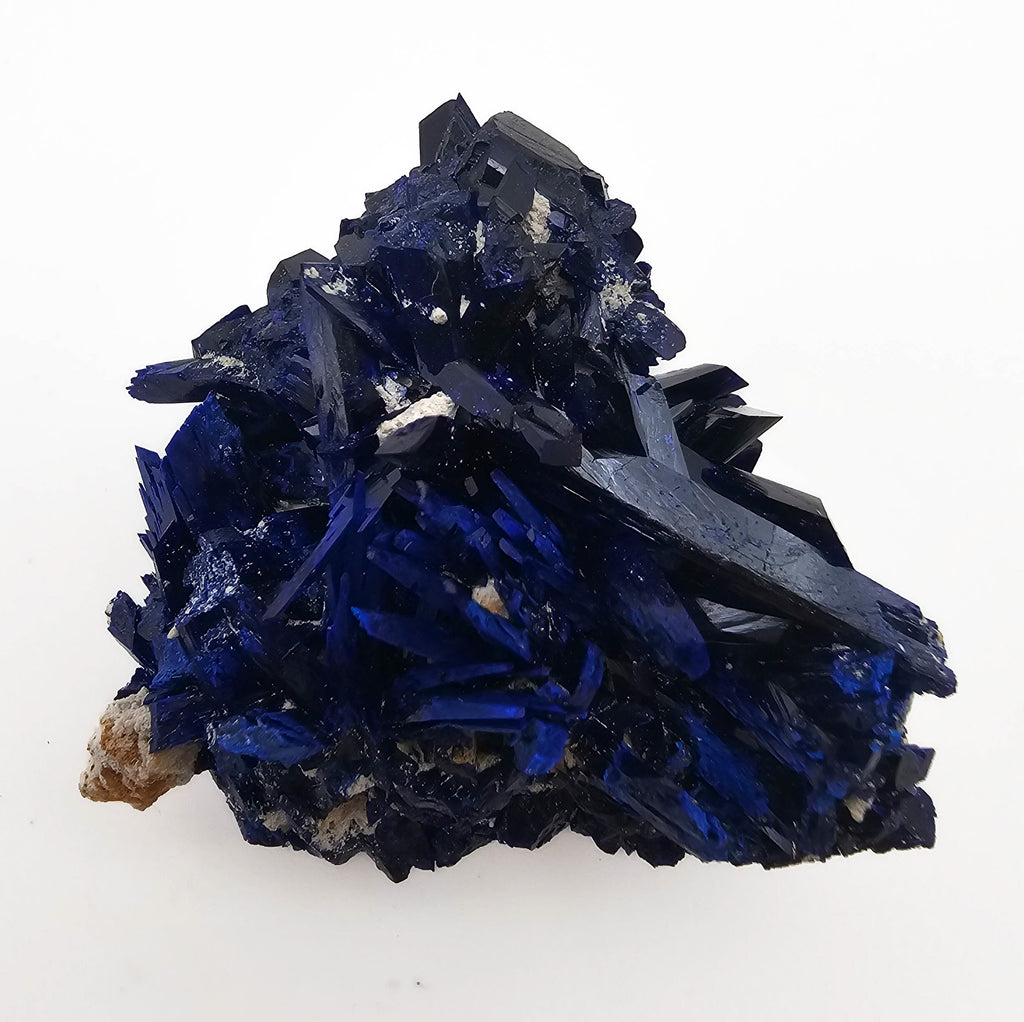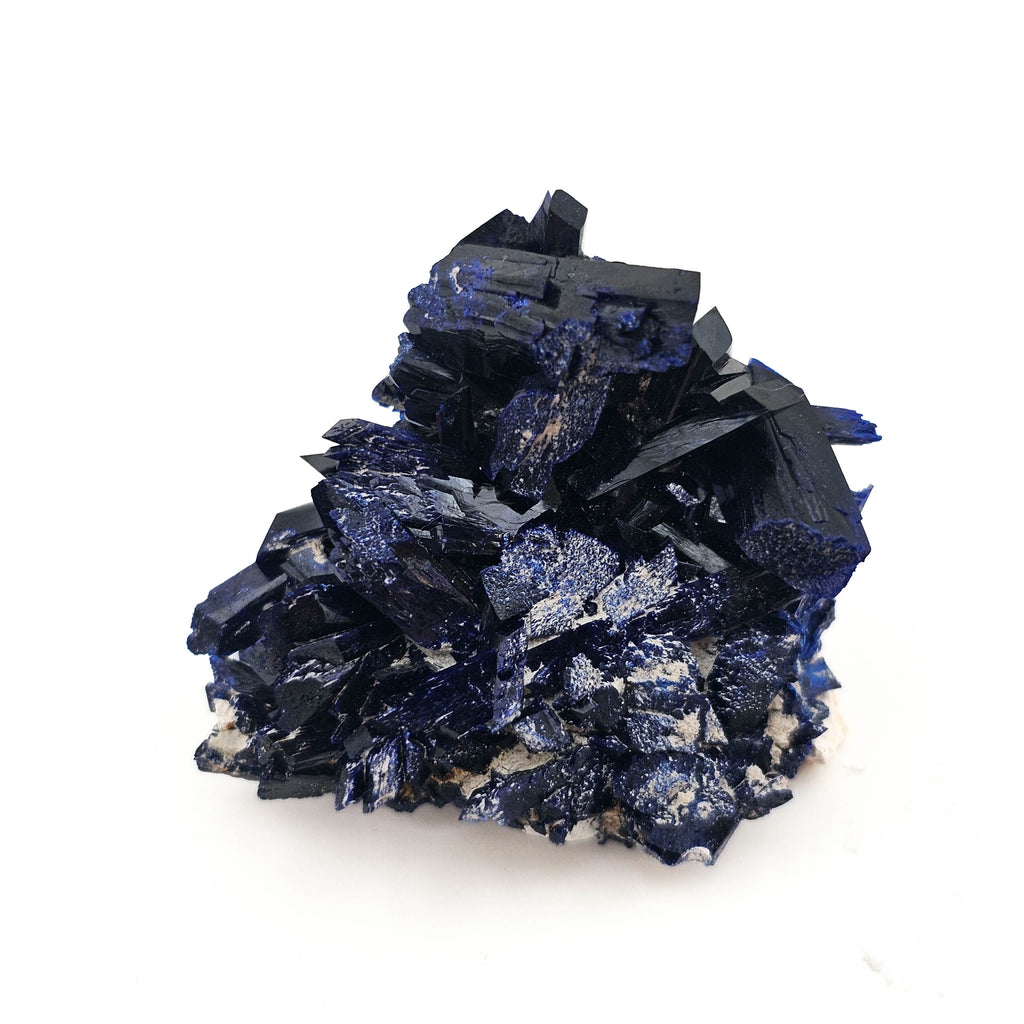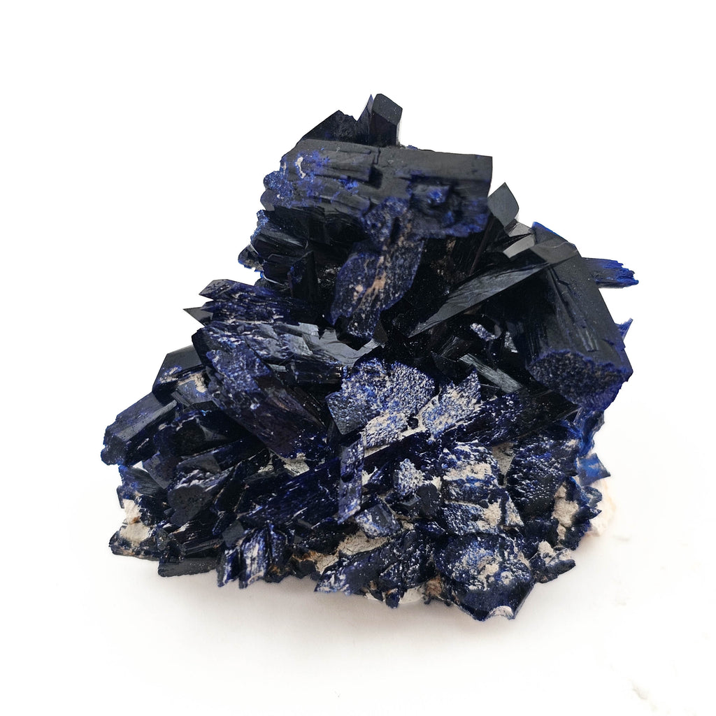 Description: This azurite from Oumjrane, Morocco is a solid little cluster with really sharp, chunky crystals packed together tight. It’s got that dark, almost black look at first glance, but when the light hits it, you get those deep blue flashes coming through on the faces and edges. The crystals are well-formed and have a nice natural shine to them, and the underside has that fine, rough azurite texture that gives it a bit of contrast. It’s a sturdy piece, not delicate, and it sits well for display.
