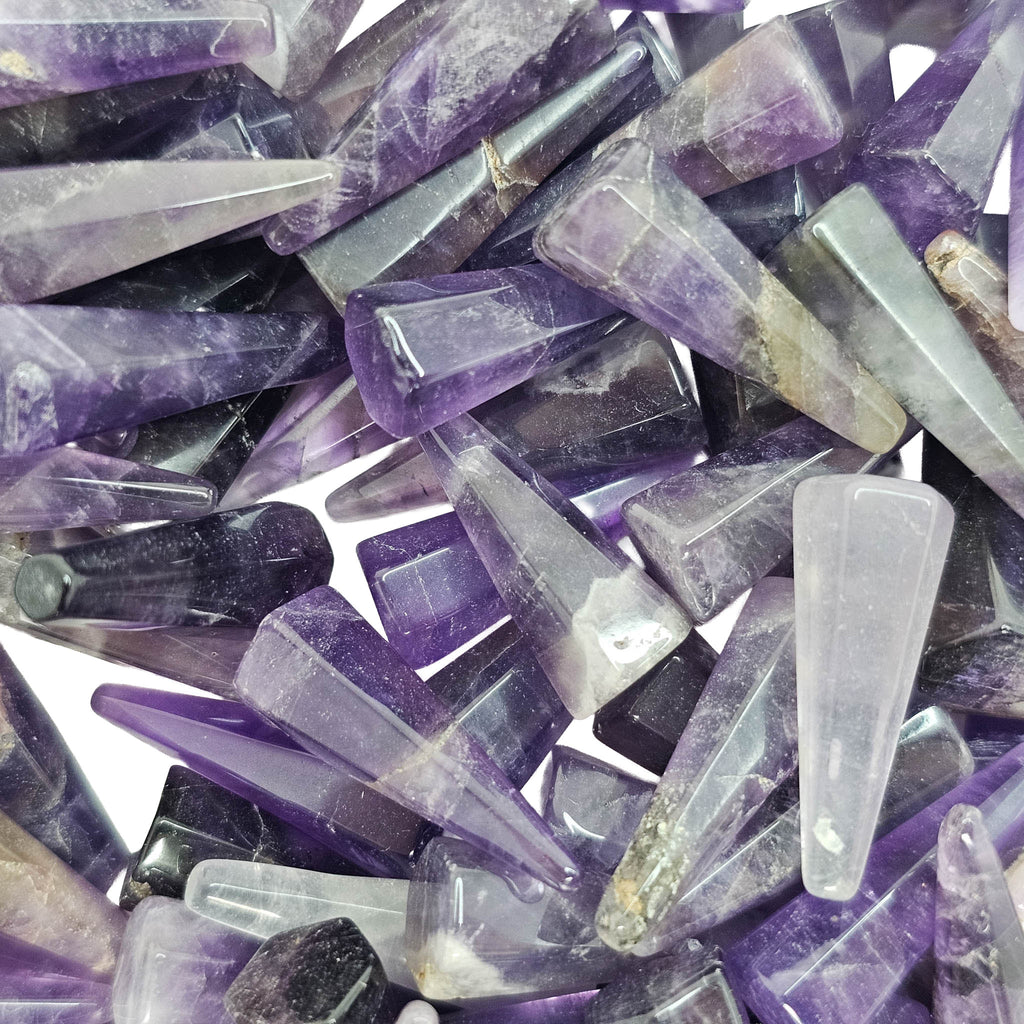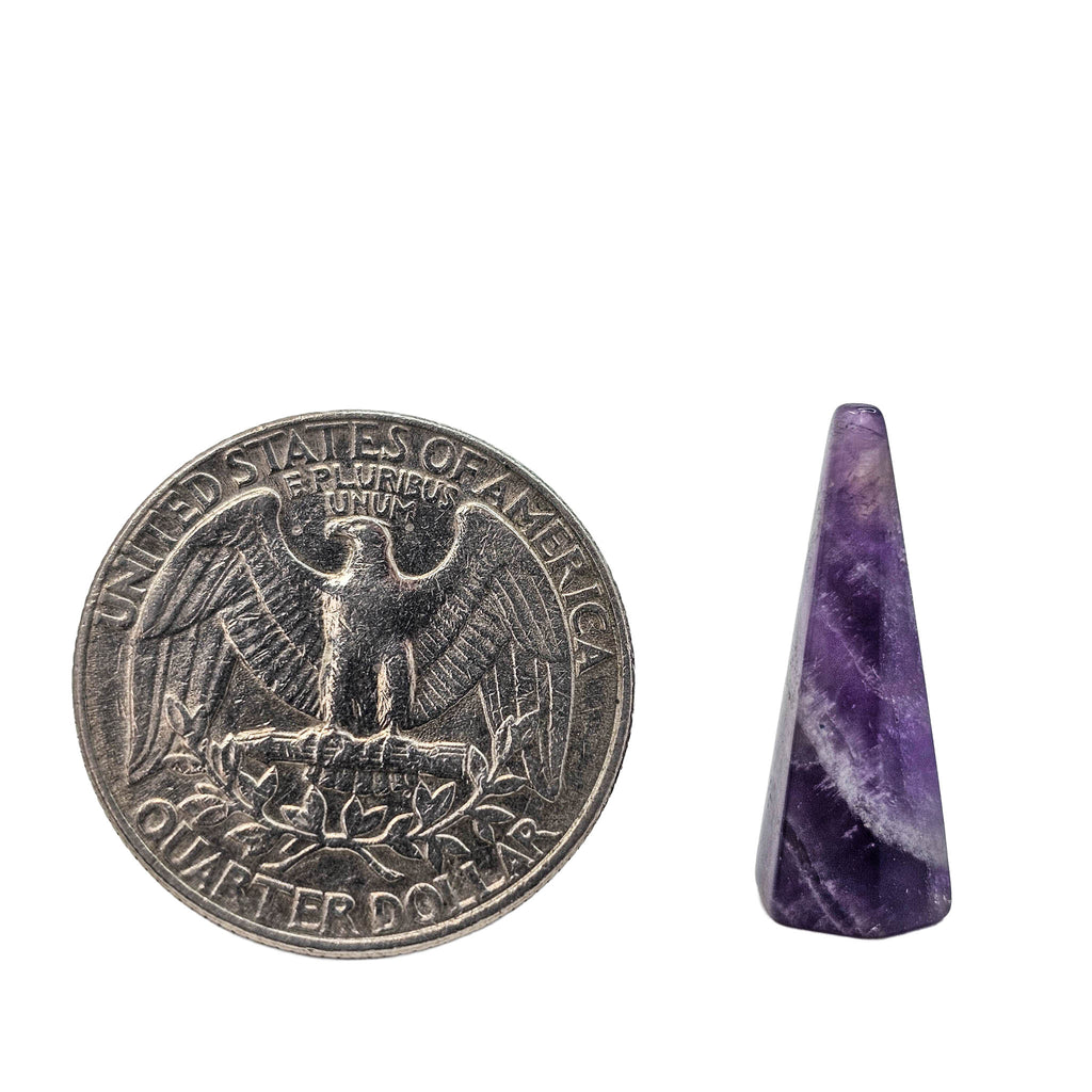 Description: This facet amethyst cone from Brazil is a polished stone shaped into a tapered cone with flat faces that catch the light and show off the material’s natural purple color. Depending on the piece, the amethyst may range from pale lavender to deeper violet, sometimes with soft zoning, cloudy areas, or internal veils. The faceted cone cut gives it a clean geometric look that works well for display, collecting, or decorative use.