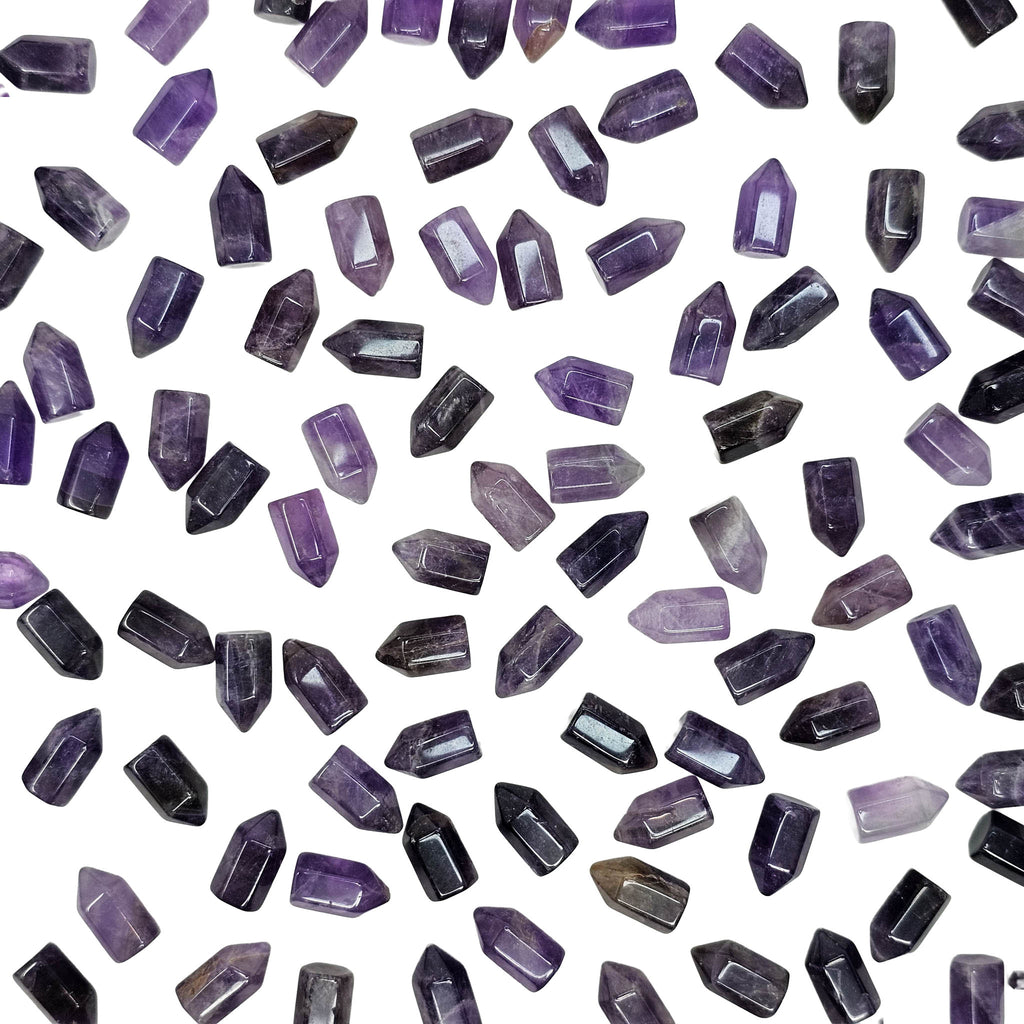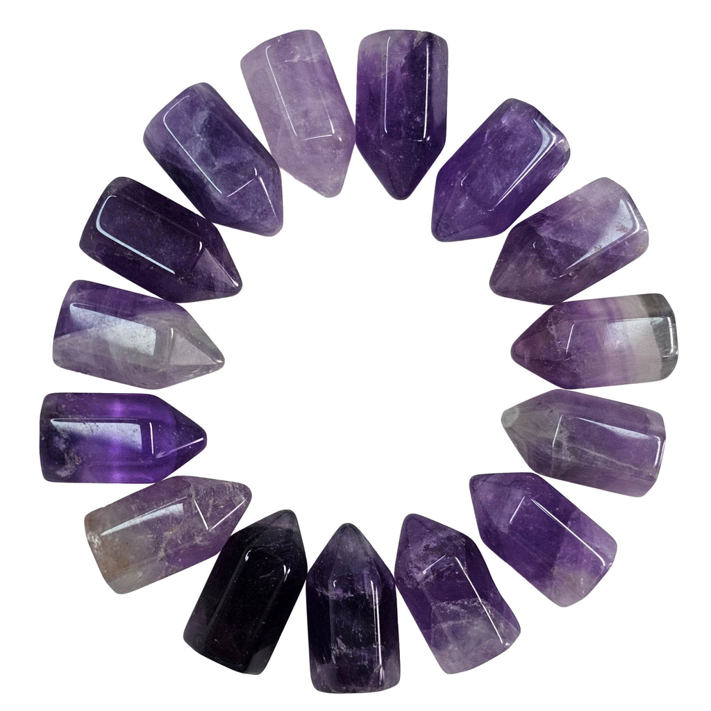 Description: Amethyst Mini Towers from Brazil are polished pieces cut into a pointed tower shape that helps show off the stone’s natural purple color. These small towers can range from pale lavender to deeper violet, sometimes with zoning, cloudy areas, or internal fractures that catch the light. Their compact size makes them easy to display on a desk, shelf, or in a smaller collection, while the polished finish gives them a clean and simple look.