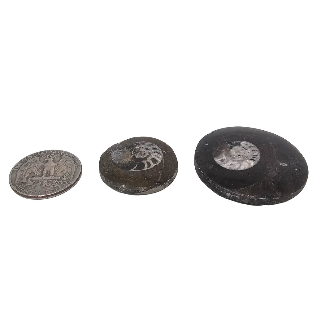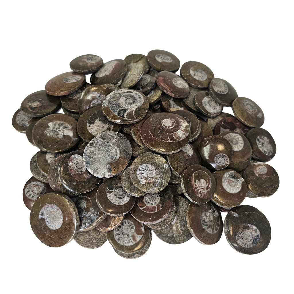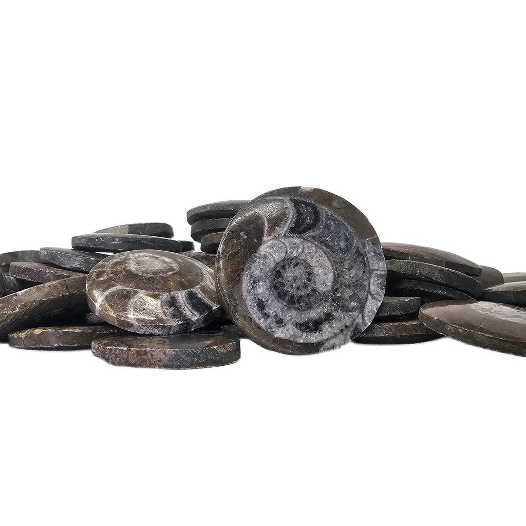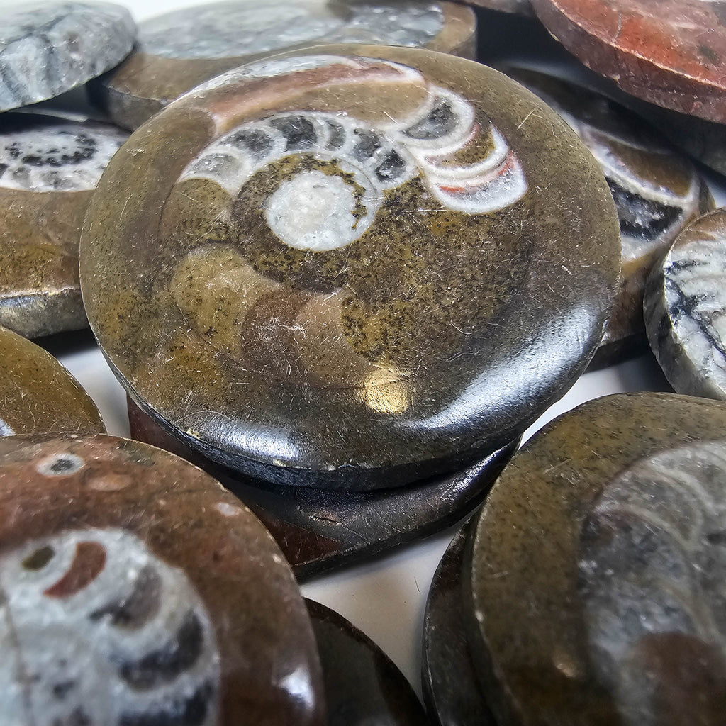 Description: These polished ammonite faces from Morocco are cut and finished to reveal the internal chamber structure of the shell. Each piece shows the classic spiral form with clearly defined chambers that once helped regulate buoyancy when the animal was alive. The polishing brings out contrast between the fossilized shell and the surrounding matrix, often highlighting fine details in the septa and growth patterns.