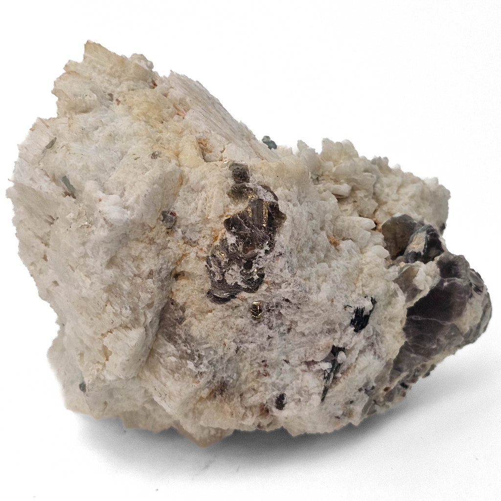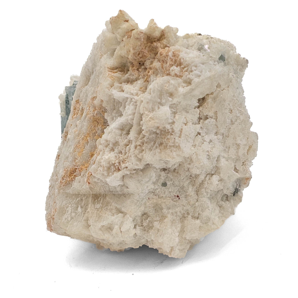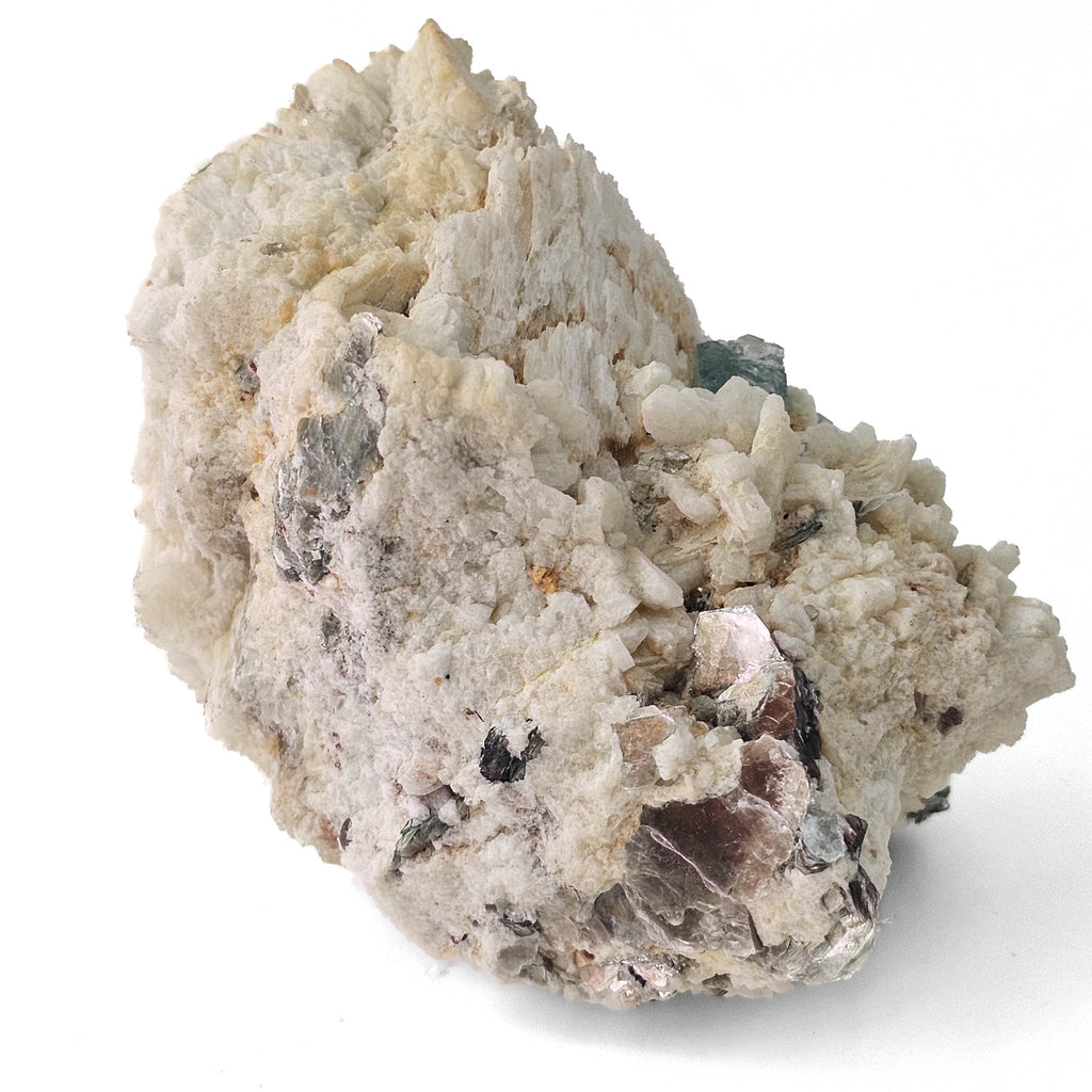 Formed within a granitic pegmatite, this association reflects a classic late-stage crystallization environment where volatile-rich fluids allowed large crystals to grow in close proximity. The muscovite indicates a potassium-rich system, while the aquamarine formed as beryllium concentrated in the final stages of melt evolution. The more embedded growth of the aquamarine suggests it developed within a tighter pocket, partially enclosed by feldspar and mica rather than fully exposed in an open cavity.