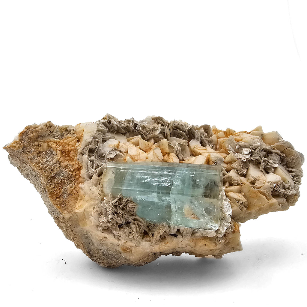 Description: This specimen features a single, well-defined aquamarine crystal set prominently across a feldspar-rich matrix, surrounded by clusters of pale muscovite in rosette formations. The aquamarine shows a soft blue to slightly greenish tone with good transparency and visible internal zoning, along with a clean, naturally terminated end. The contrast between the smooth, glassy beryl and the angular feldspar crystals, paired with the delicate mica blades, gives the piece strong texture and visual layering.