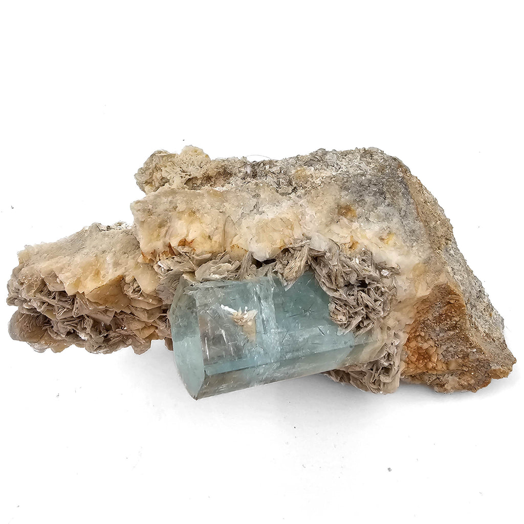 The formation reflects a late-stage pegmatitic environment where mineral growth occurred in a sequence. Feldspar crystallized first, forming the structural base, followed by muscovite growing in platy aggregates. Aquamarine formed last from beryllium-rich fluids that moved through open spaces in the pegmatite, allowing for the development of a larger, more isolated crystal. The iron staining visible in parts of the matrix suggests later fluid activity, adding warm tones to the otherwise neutral host rock.