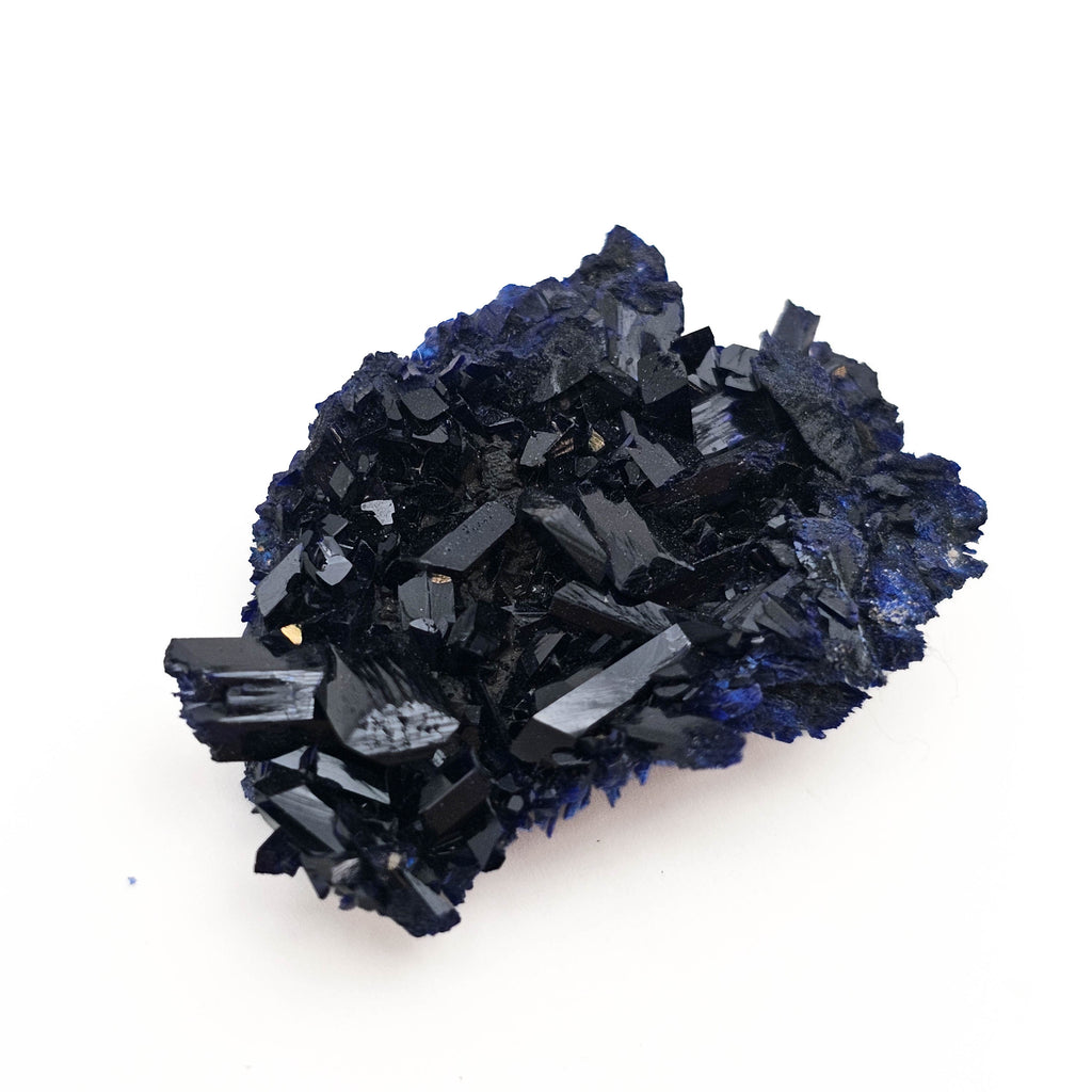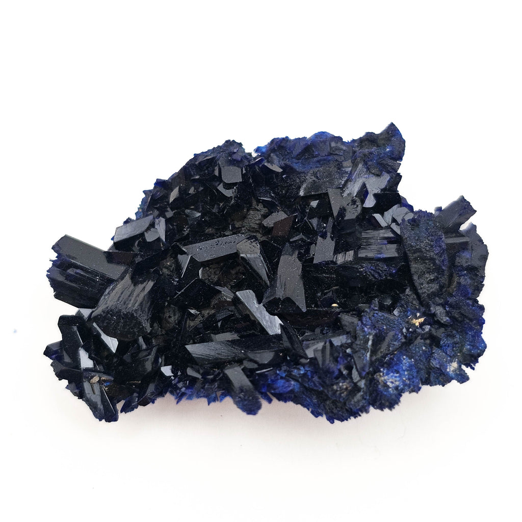 Description: This azurite from Oumjrane, Morocco is a solid little cluster with really sharp, chunky crystals packed together tight. It’s got that dark, almost black look at first glance, but when the light hits it, you get those deep blue flashes coming through on the faces and edges. The crystals are well-formed and have a nice natural shine to them, and the underside has that fine, rough azurite texture that gives it a bit of contrast. It’s a sturdy piece, not delicate, and it sits well for display.