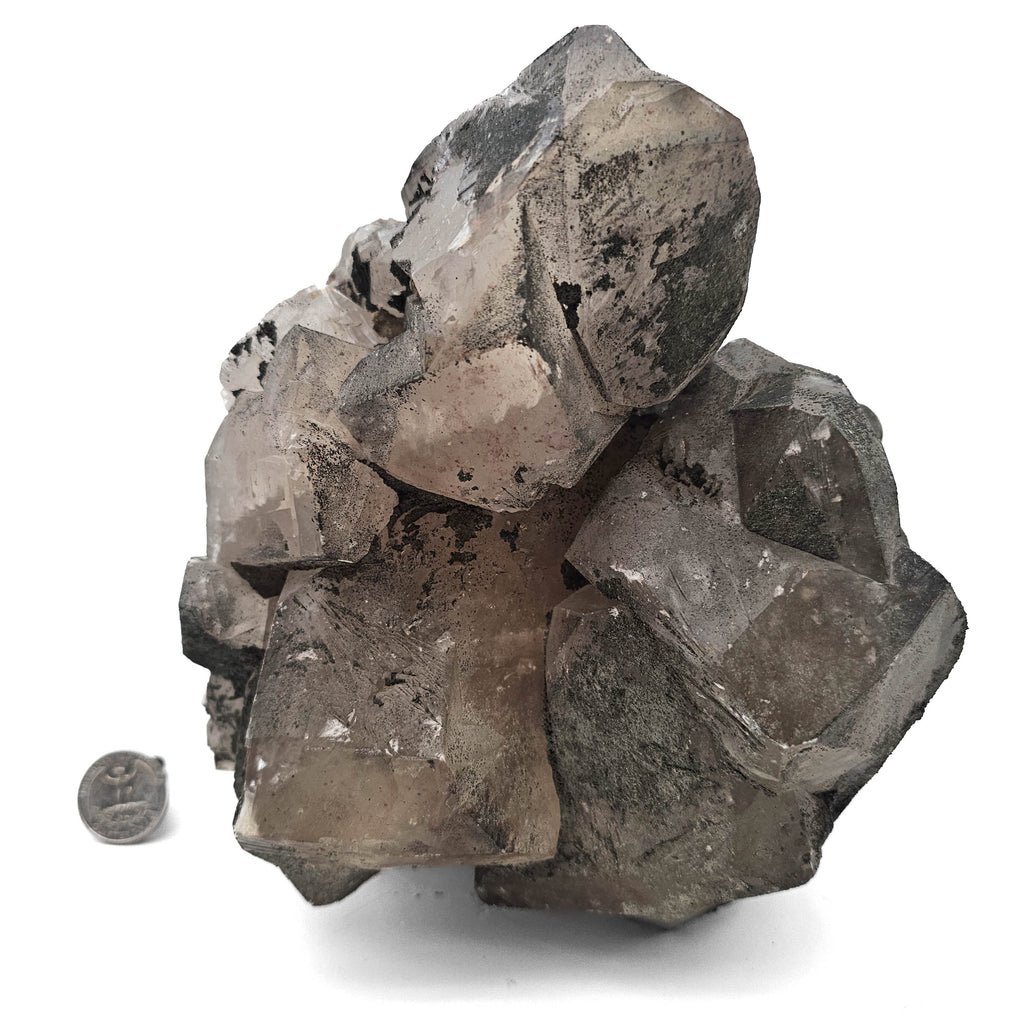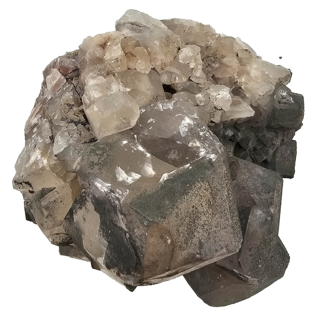 Description: This one of a kind calcite specimen from Dundas, Ontario has a much heavier, more sculptural look than a typical light calcite cluster. The photos show thick, blocky calcite crystals with smoky gray to nearly colorless transparency, many of them carrying dark surface coatings or inclusions that give the piece a dramatic two-tone appearance. Around and between those larger crystals are creamy white to faint pinkish calcite masses that add contrast and make the specimen look layered rather than uniform. It has real cabinet presence, especially because the crystal forms are large, crowded, and irregular in a way that feels natural and substantial.