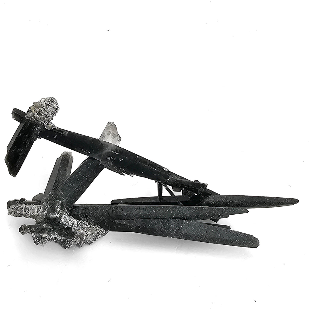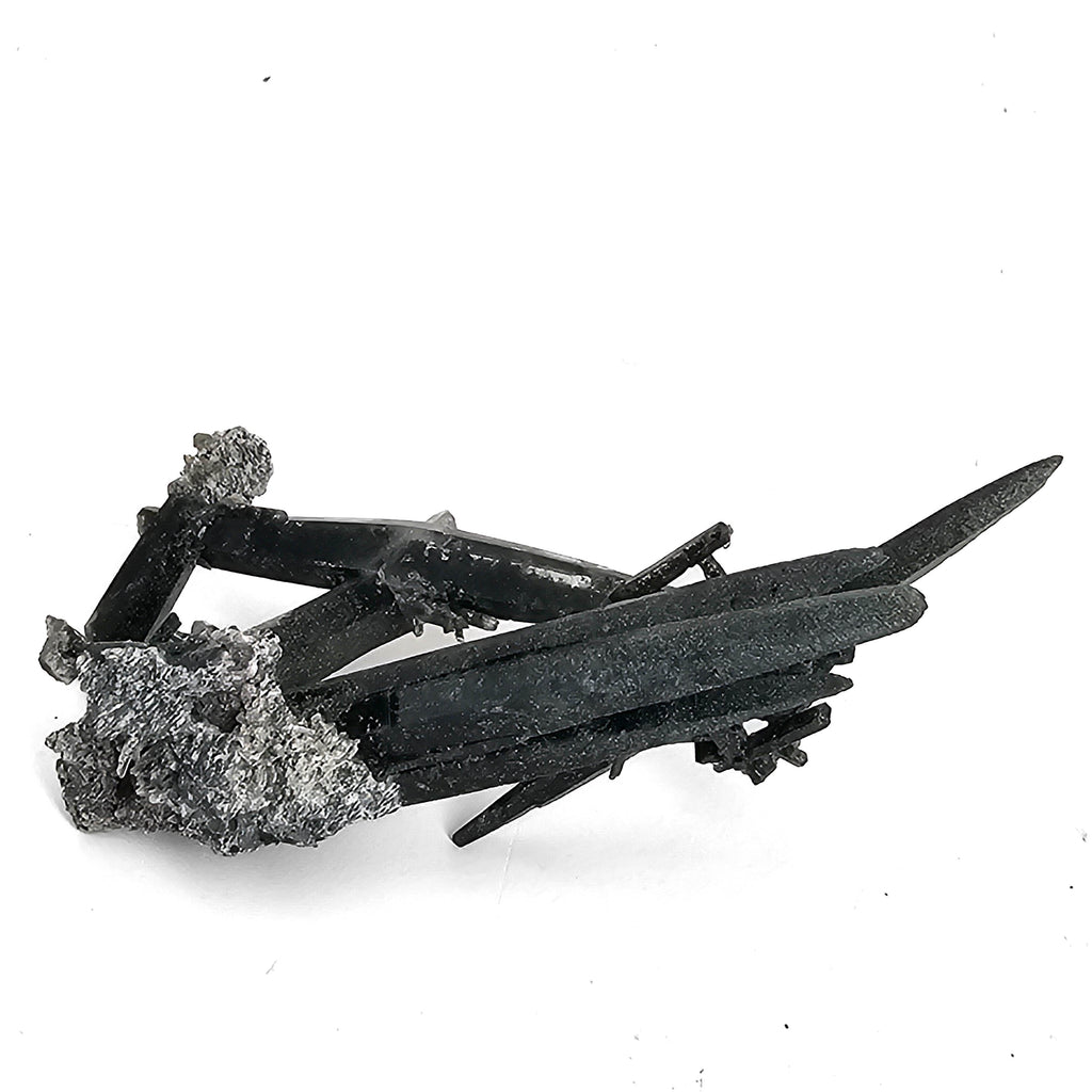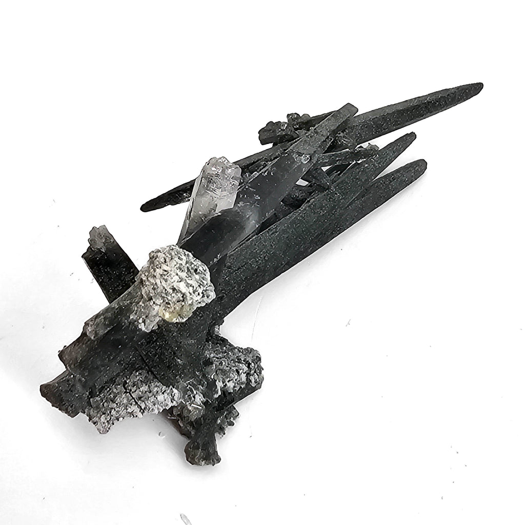 Description: This one of a kind chlorite quartz specimen from Ganesh Himal has a striking, sculptural look. The quartz crystals are long, narrow, and sharply pointed, with a dark chlorite-rich appearance that gives the whole piece a dramatic black to deep charcoal tone. From the photos, the specimen has a very linear, blade-like arrangement, with several crystals crossing and stacking over one another in a way that makes it look architectural rather than chunky. There are also small clear to pale quartz points and bits of matrix still attached, which add contrast and keep it looking natural and untrimmed.