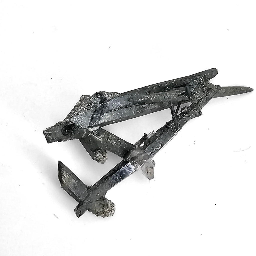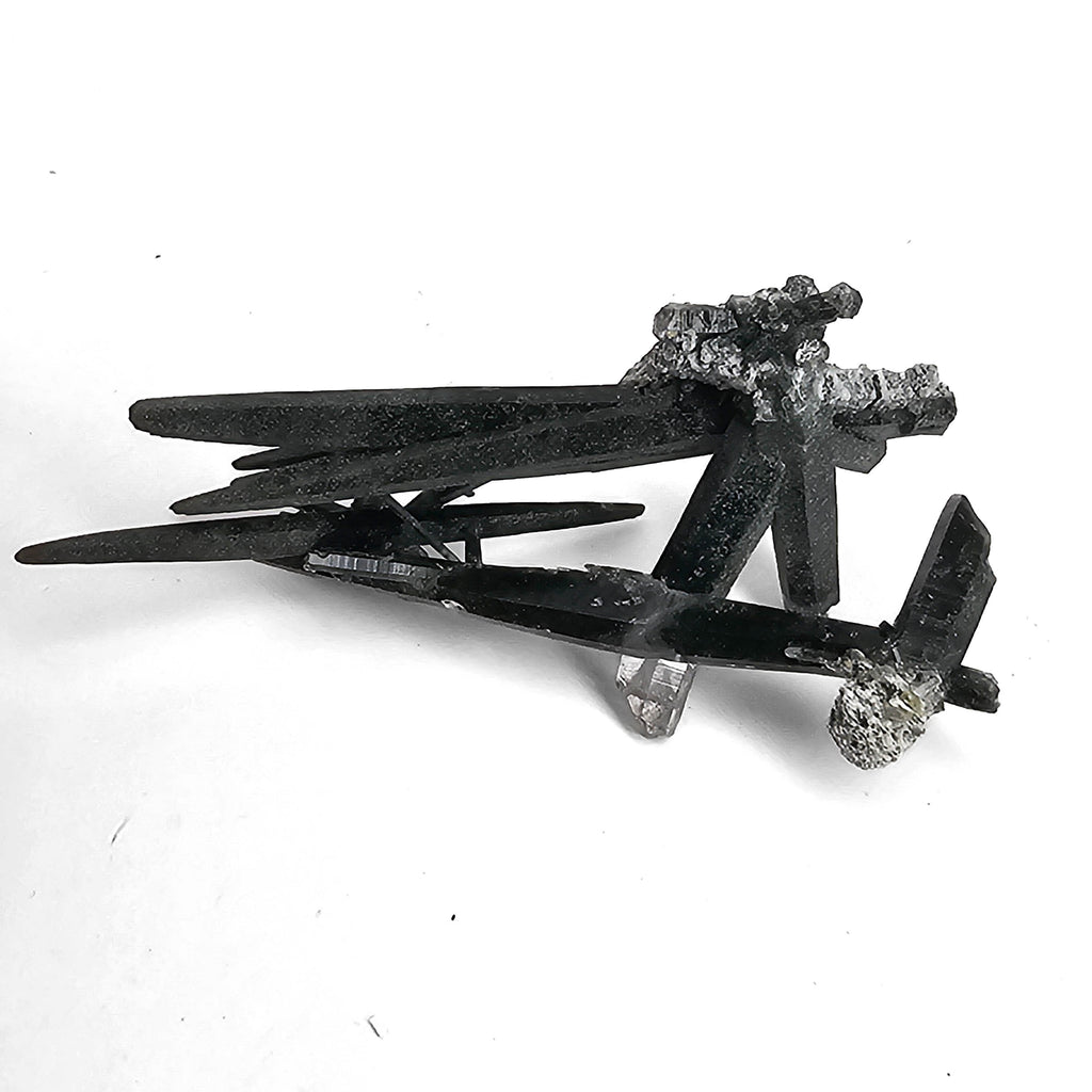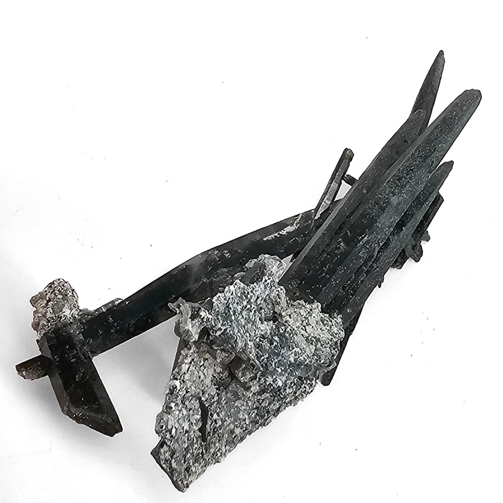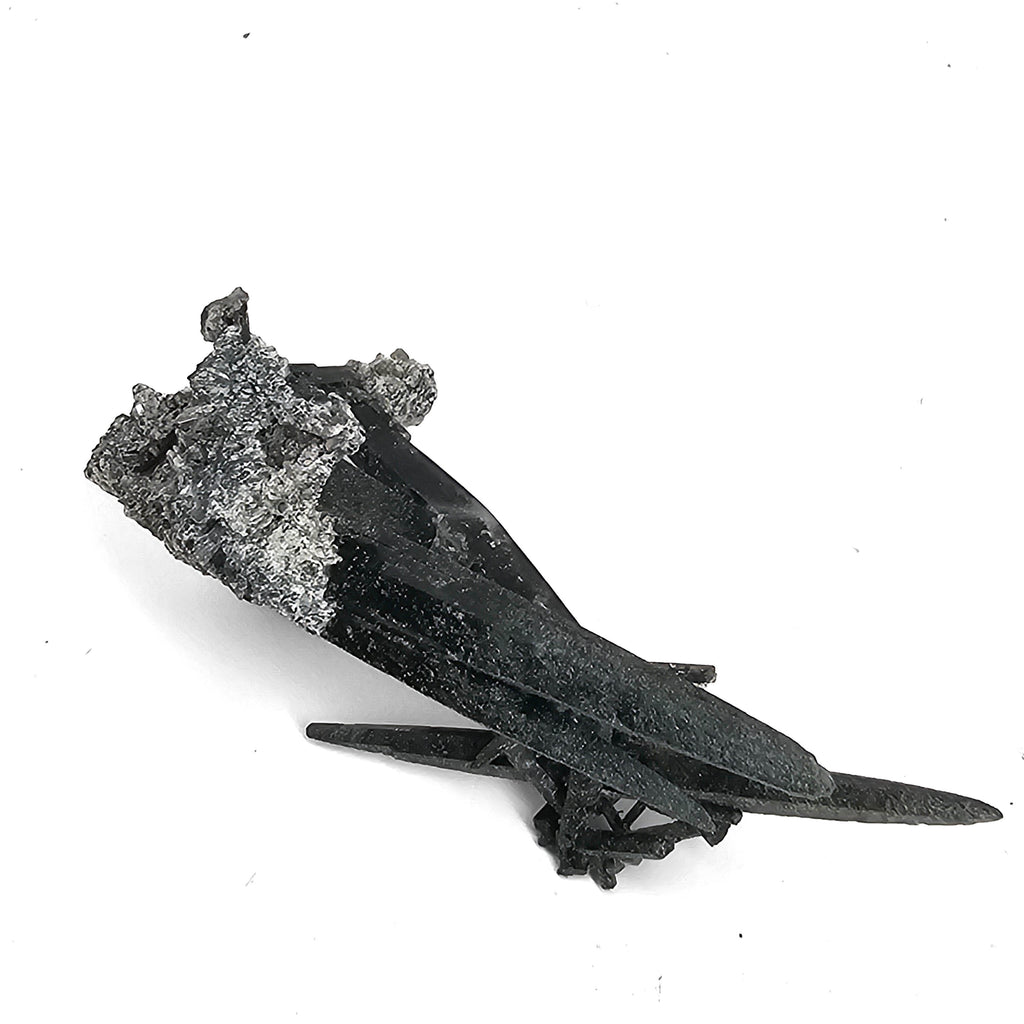 Description: This one of a kind chlorite quartz specimen from Ganesh Himal has a striking, sculptural look. The quartz crystals are long, narrow, and sharply pointed, with a dark chlorite-rich appearance that gives the whole piece a dramatic black to deep charcoal tone. From the photos, the specimen has a very linear, blade-like arrangement, with several crystals crossing and stacking over one another in a way that makes it look architectural rather than chunky. There are also small clear to pale quartz points and bits of matrix still attached, which add contrast and keep it looking natural and untrimmed.