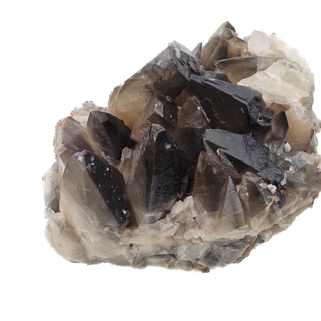Description: This specimen shows sharply developed scalenohedral calcite crystals with a distinct smoky-gray to dark brown coloration. The darker tones are caused by internal inclusions and light iron staining, giving the crystals a denser, more opaque appearance compared to typical honey-colored examples. The crystals grew in open cavities within a hydrothermal system, where mineral-rich fluids allowed calcite to crystallize outward into well-defined, pointed forms. The contrast between the darker crystal tips and the lighter, blocky calcite matrix beneath highlights multiple stages of growth and changing chemistry during formation.