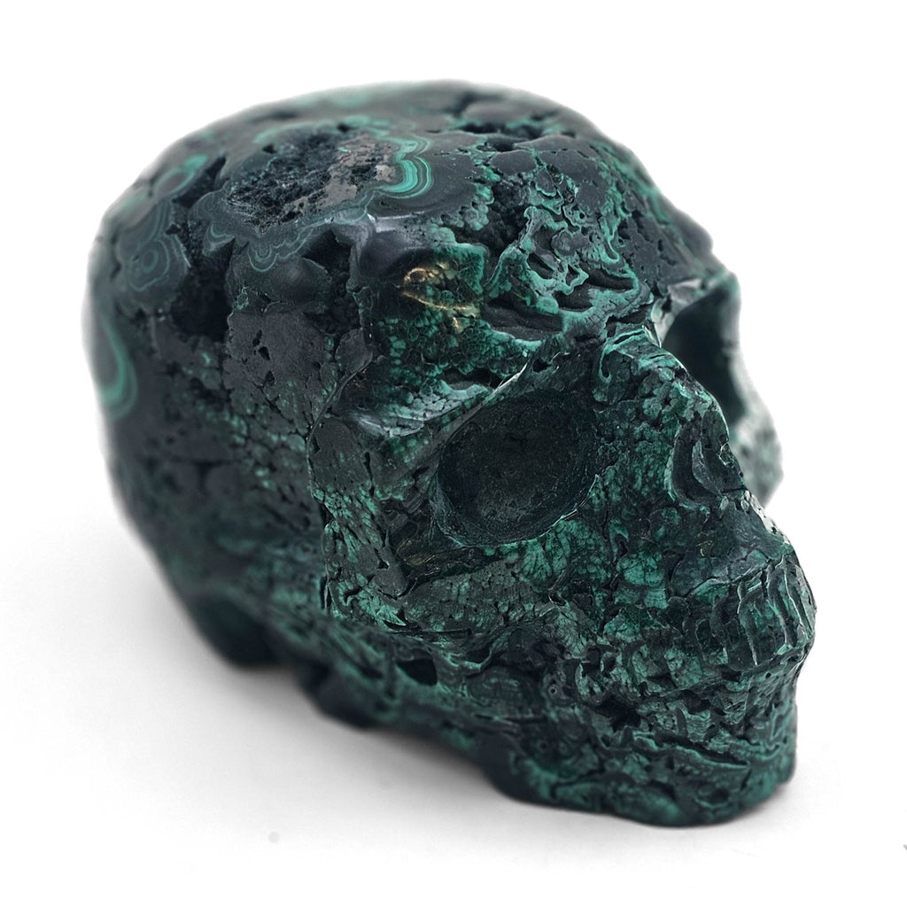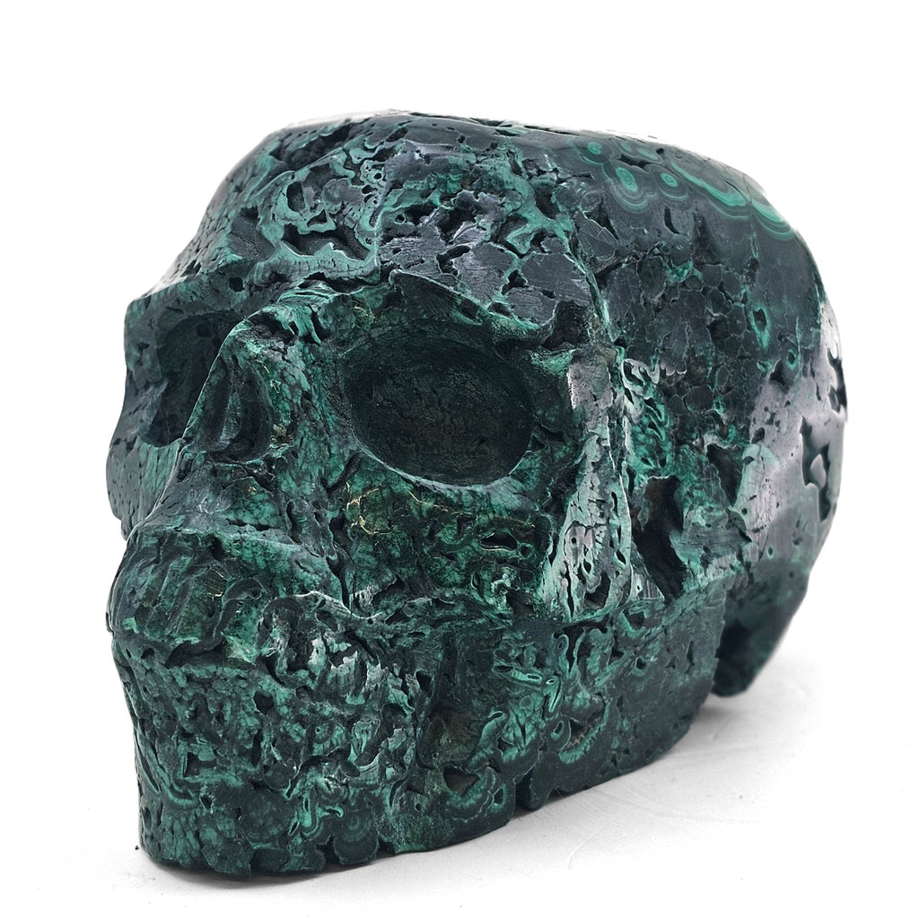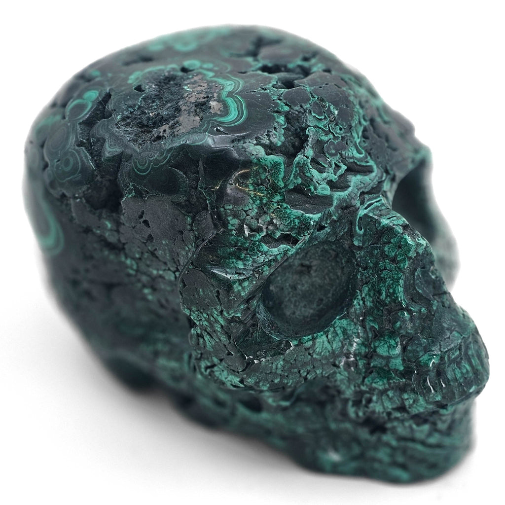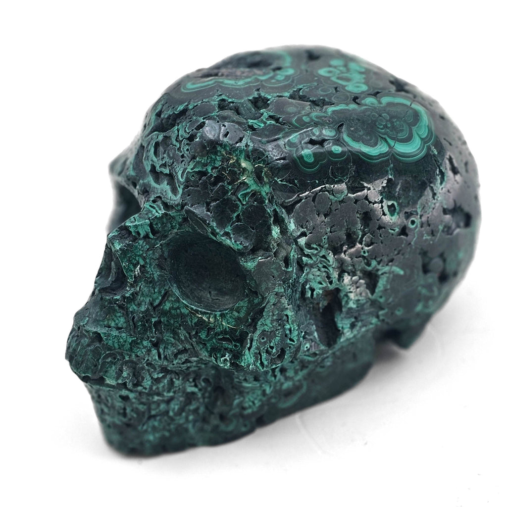 Description: This carved malachite skull from the Congo features deep green tones with classic concentric banding and occasional eye-like patterns visible across the surface. Unlike highly polished pieces, this carving retains a more natural, textured finish that highlights the raw, uneven structure of the material. Variations in color—from dark forest green to lighter, almost mint-toned zones—trace the original mineral growth, giving the piece a rugged, organic appearance while still maintaining clear skull definition.