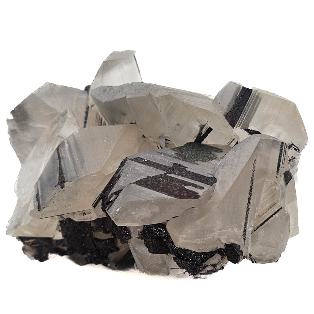 Description: This specimen features sharply defined “Mercedes” calcite crystals—flat, geometric blades intersecting at tight angles to form a layered, star-like cluster. The crystals are semi-translucent with a pale, slightly milky tone, and show strong internal zoning and clean cleavage faces. What immediately stands out are the bold black bands running through the crystals, appearing almost like inked lines. These are chalcopyrite inclusions captured during crystal growth, creating a striking contrast against the lighter calcite.