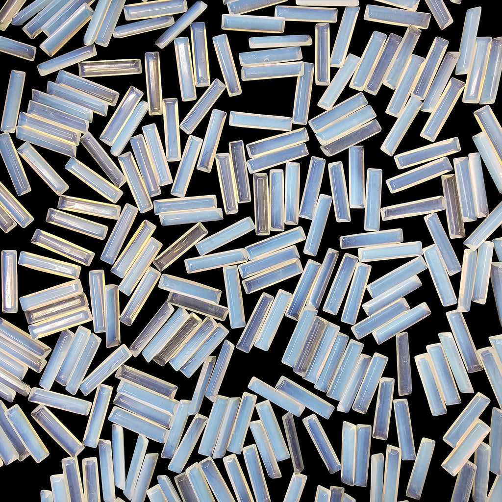 Description: These tumbled opalite faceted rectangles from China are precision-cut glass pieces designed to replicate the soft glow of natural opal. The rectangular shape with faceted edges gives them a clean, geometric look, while the polish enhances their characteristic milky-blue sheen. Depending on lighting, they can shift between cool blue and warmer amber tones, creating a consistent and predictable visual effect across each piece.