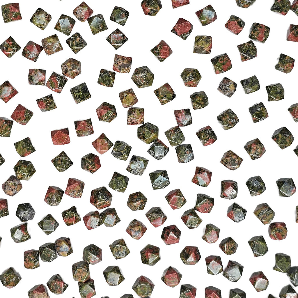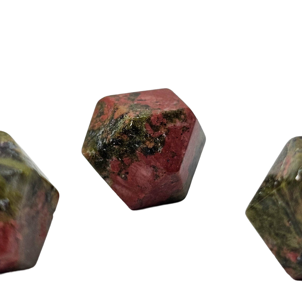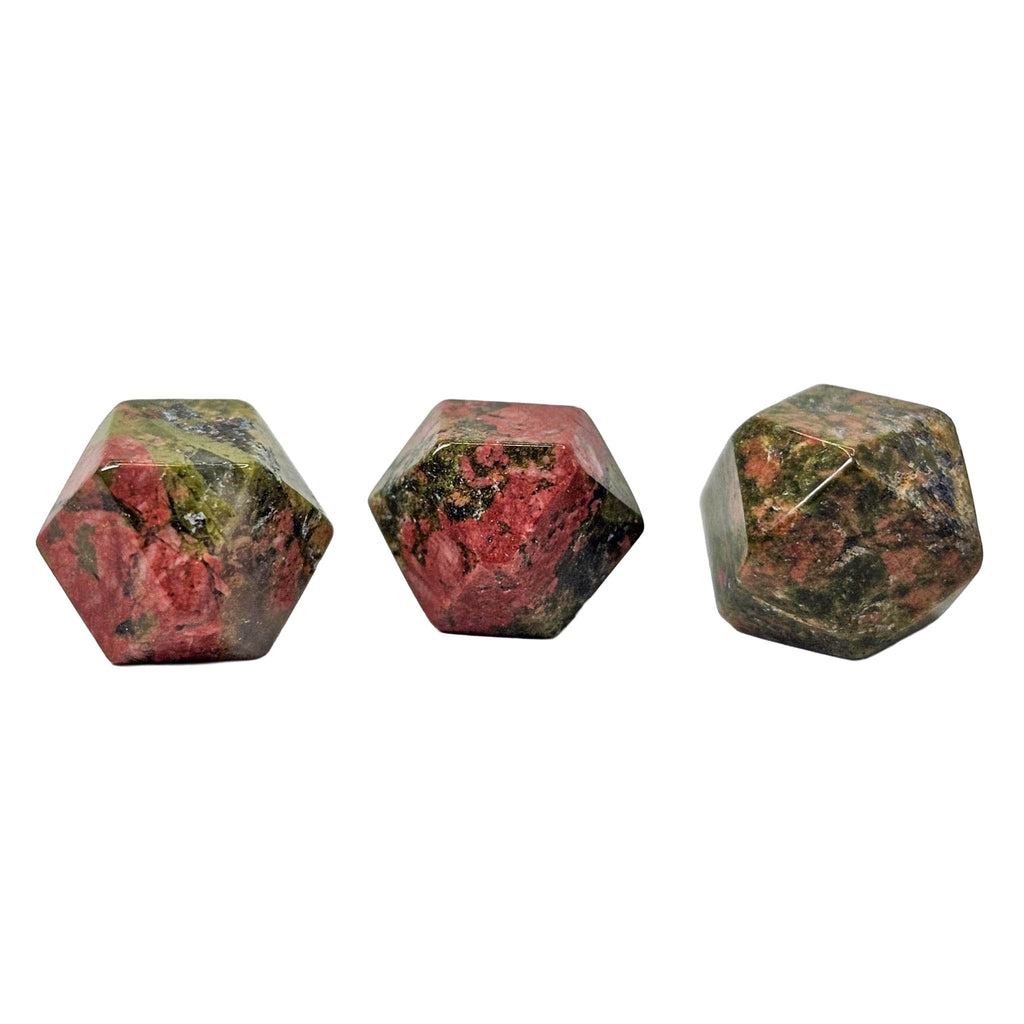 Description: This unakite tetradecagon from Ontario, Canada has been cut and polished into a geometric fourteen-sided shape that gives the stone a clean, finished look. Unakite is easily recognized by its natural mix of green epidote, pink feldspar, and clear to gray quartz, which together create a mottled pattern with strong contrast. In this carved form, the flat faces and even shape make the color mix stand out in a more structured and decorative way than a standard tumble.