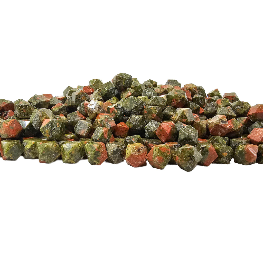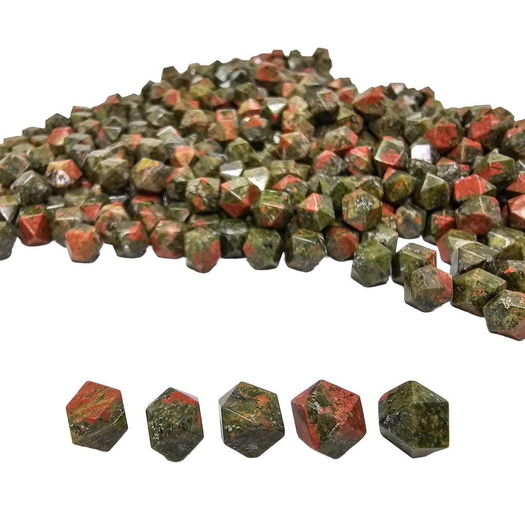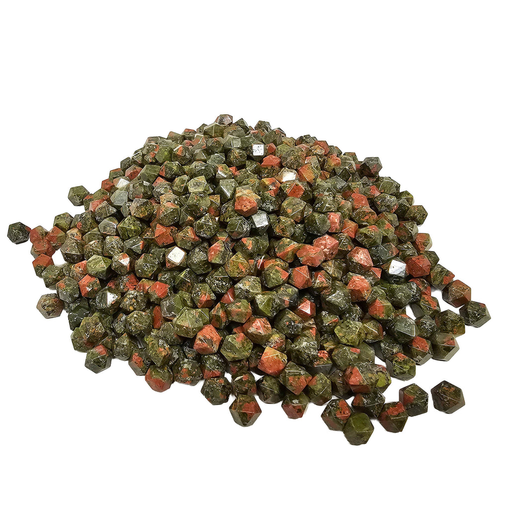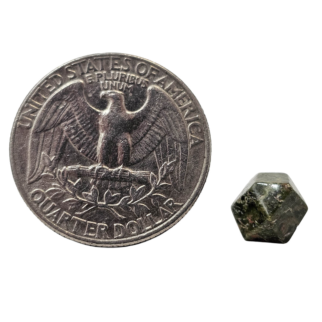 Description: This unakite tetradecagon from Ontario, Canada has been cut and polished into a geometric fourteen-sided shape that gives the stone a clean, finished look. Unakite is easily recognized by its natural mix of green epidote, pink feldspar, and clear to gray quartz, which together create a mottled pattern with strong contrast. In this carved form, the flat faces and even shape make the color mix stand out in a more structured and decorative way than a standard tumble.