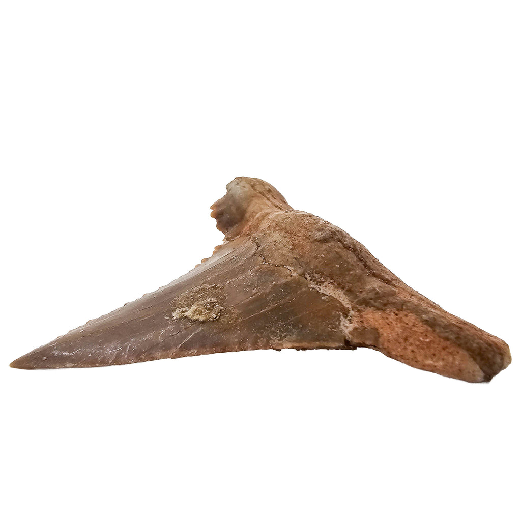Description: This fossilized Otodus shark tooth from Morocco comes from an extinct group of large predatory sharks that lived during the early Cenozoic Era, roughly 60–45 million years ago. Otodus sharks were among the dominant marine predators of their time and are considered early relatives in the evolutionary lineage that eventually led to the giant megalodon. Their teeth are large, triangular, and often feature fine serrations designed for slicing through prey.