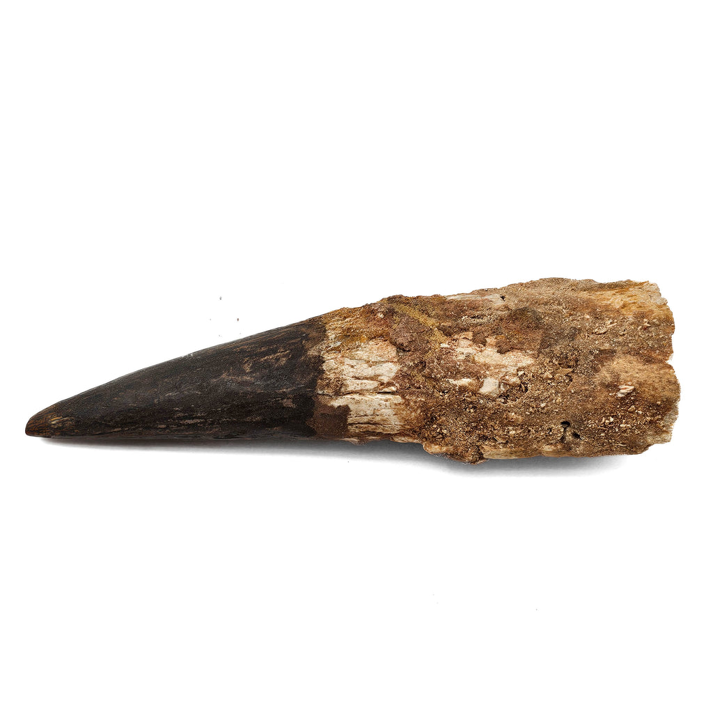 Description: This one of a kind Spinosaurus tooth fossil specimen has a long, narrow crown with a dark brown to near-black enamel tip and a broad, heavily preserved root section. The tooth has a strong taper and slight curve, with the pointed end still intact and the upper half coated in light brown matrix and fossilized root texture. The contrast between the smooth enamel and the rougher root area makes the overall shape easy to read.