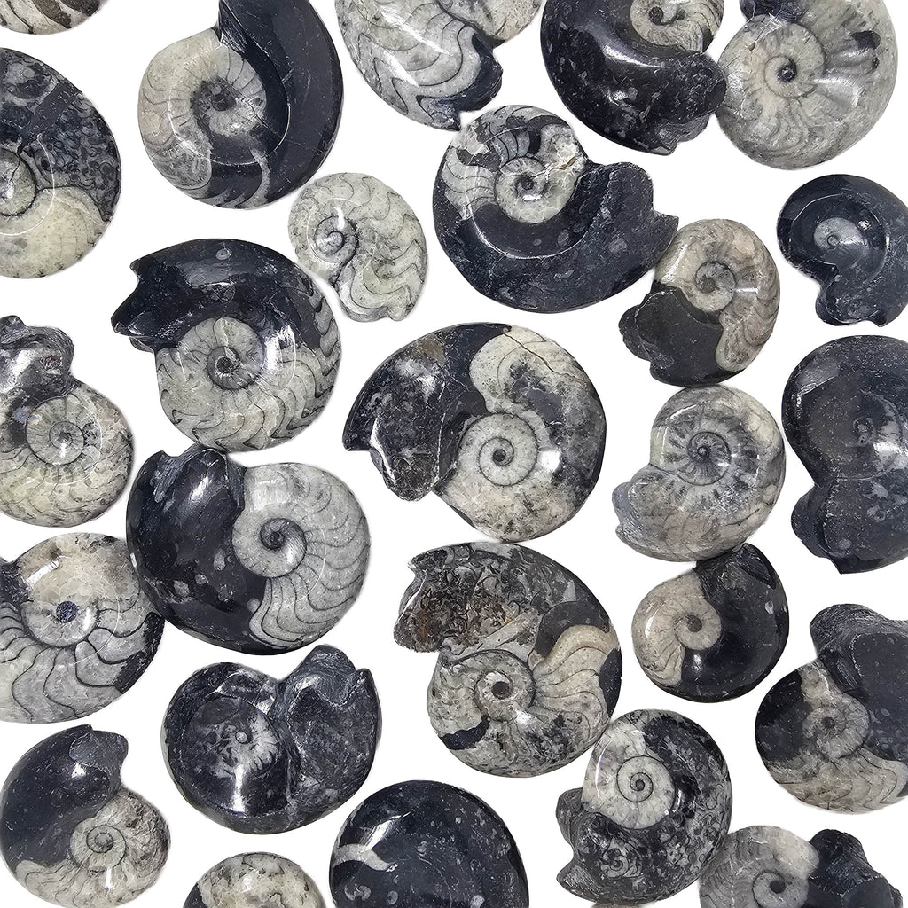 Description: These Moroccan ammonites are fossilized remains of extinct marine cephalopods that lived in ancient oceans during the Mesozoic era. Each piece shows the classic spiral shell structure, often with visible chamber divisions (septa) and natural suture patterns that formed as the animal grew. The contrast between lighter calcified sections and darker matrix gives these specimens a clear, recognizable look, and many have been naturally or lightly polished to highlight internal detail.