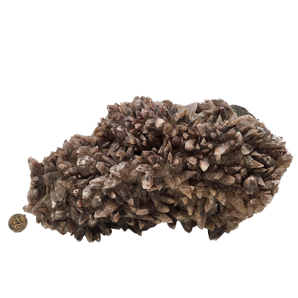 Description: This one of a kind calcite pyrite specimen from Dundas Quarry, Ontario has a crowded, dramatic surface packed with sharp calcite points and scattered metallic pyrite. The calcite crystals range from pale translucent to smoky gray with reddish-brown staining across many of the faces, giving the piece a warm, earthy look instead of a plain white appearance. The crystal coverage is heavy from end to end, with tight sprays and starburst-like groupings that create a dense, bristling texture across the whole specimen. In the photos, the mix of glassy luster, iron-toned staining, and brassy metallic patches gives it a rugged but attractive collector look.