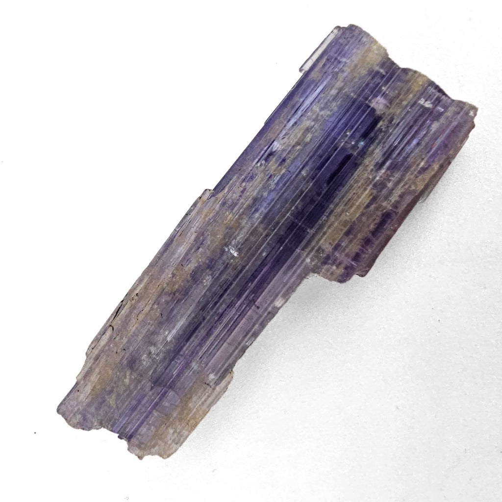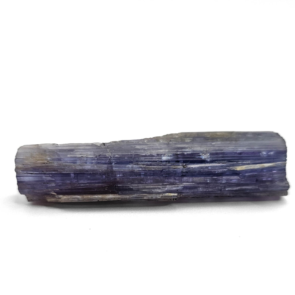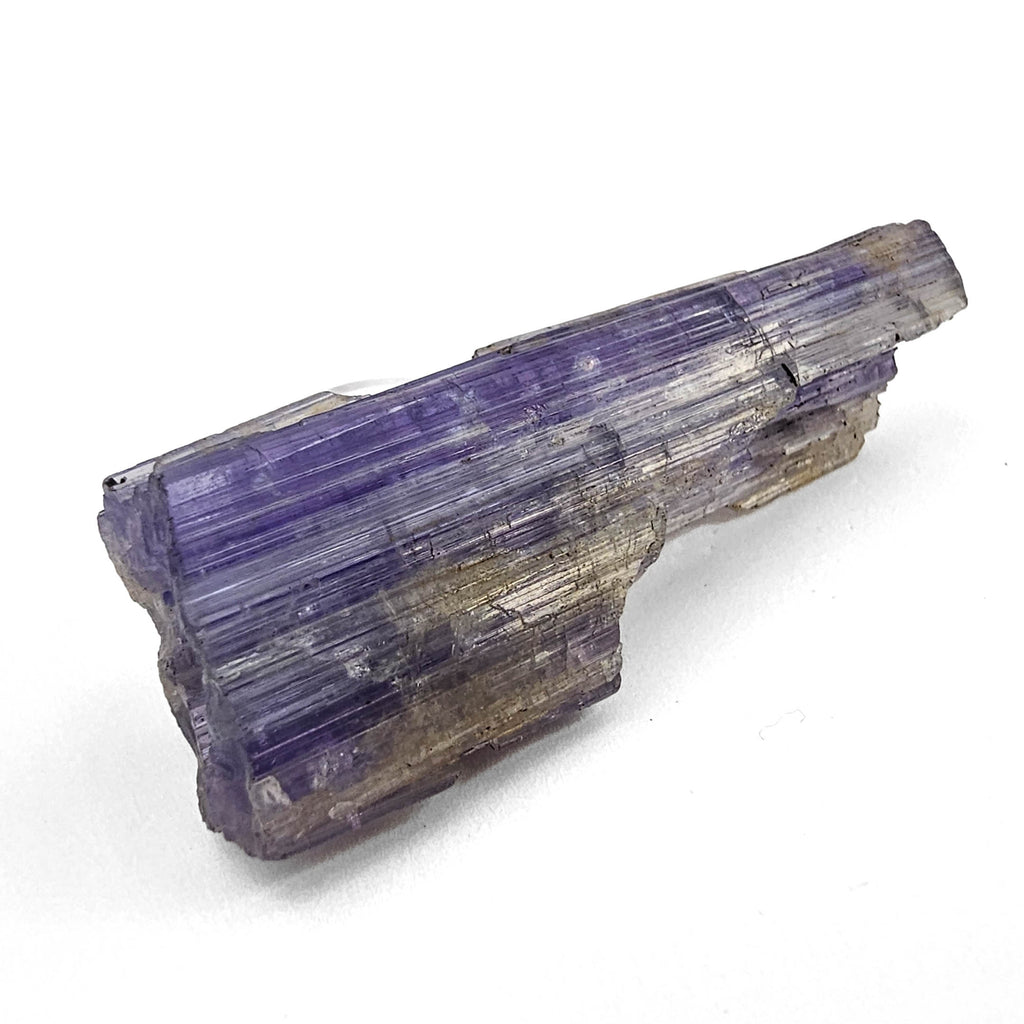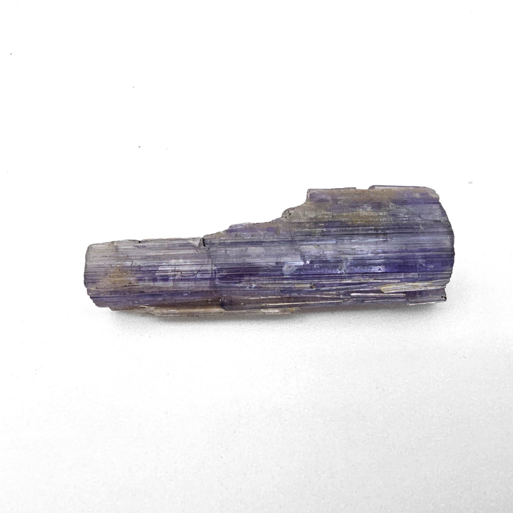 Description: This one of a kind tanzanite specimen has a long, blade-like crystal form with a soft violet to lavender-blue color that shifts in intensity across the surface. It is a more linear and architectural piece than the chunkier tanzanite crystals, with obvious parallel growth lines running the full length of the specimen. The surfaces are raw and natural, with stepped edges, broken terminations, and areas of lighter weathering or attached matrix that show it has not been cleaned into something overly polished or artificial. The appeal here is in the length, the sharp striated structure, and the way the color sits in bands through the crystal.