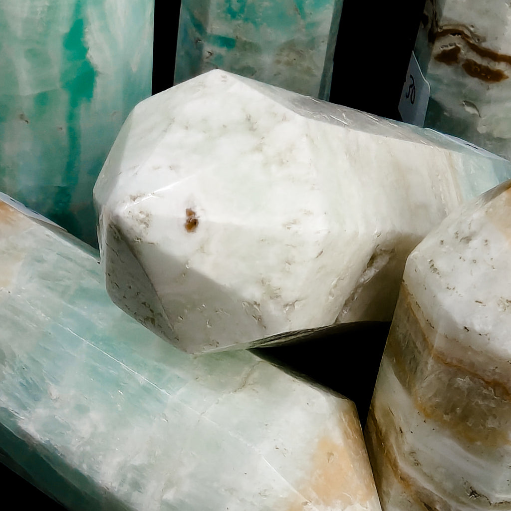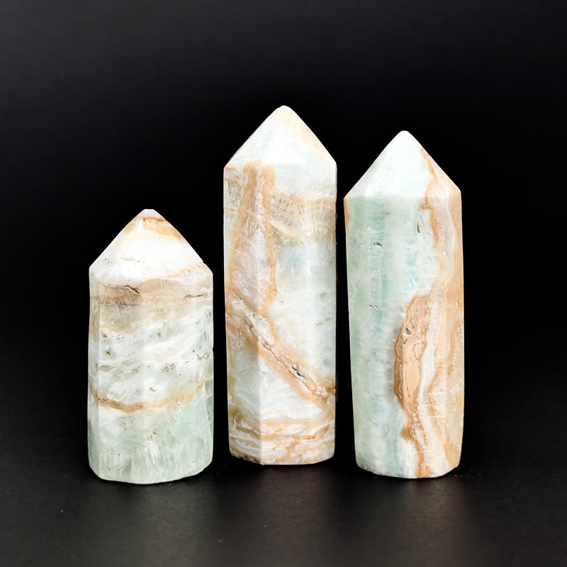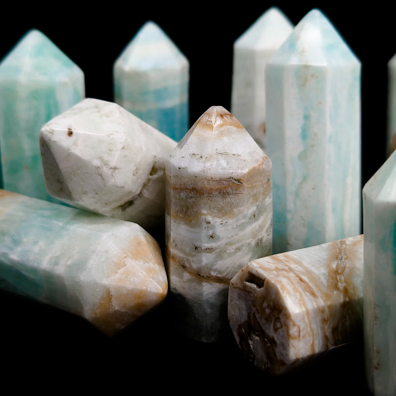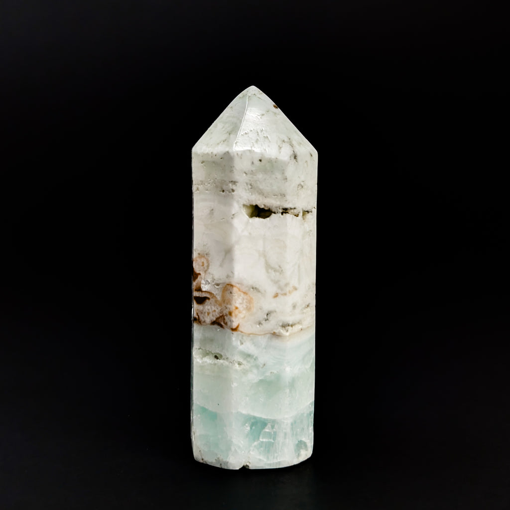 Geologically, Caribbean Calcite is made up of blue calcite and white to beige aragonite—both calcium carbonate minerals that formed together in sedimentary environments. These minerals developed in rhythmic, layered bands over time, creating striking patterns that resemble natural seascapes. When shaped into towers, the interplay of color and translucency becomes even more pronounced, turning each specimen into a sculptural display of Earth’s artistry.