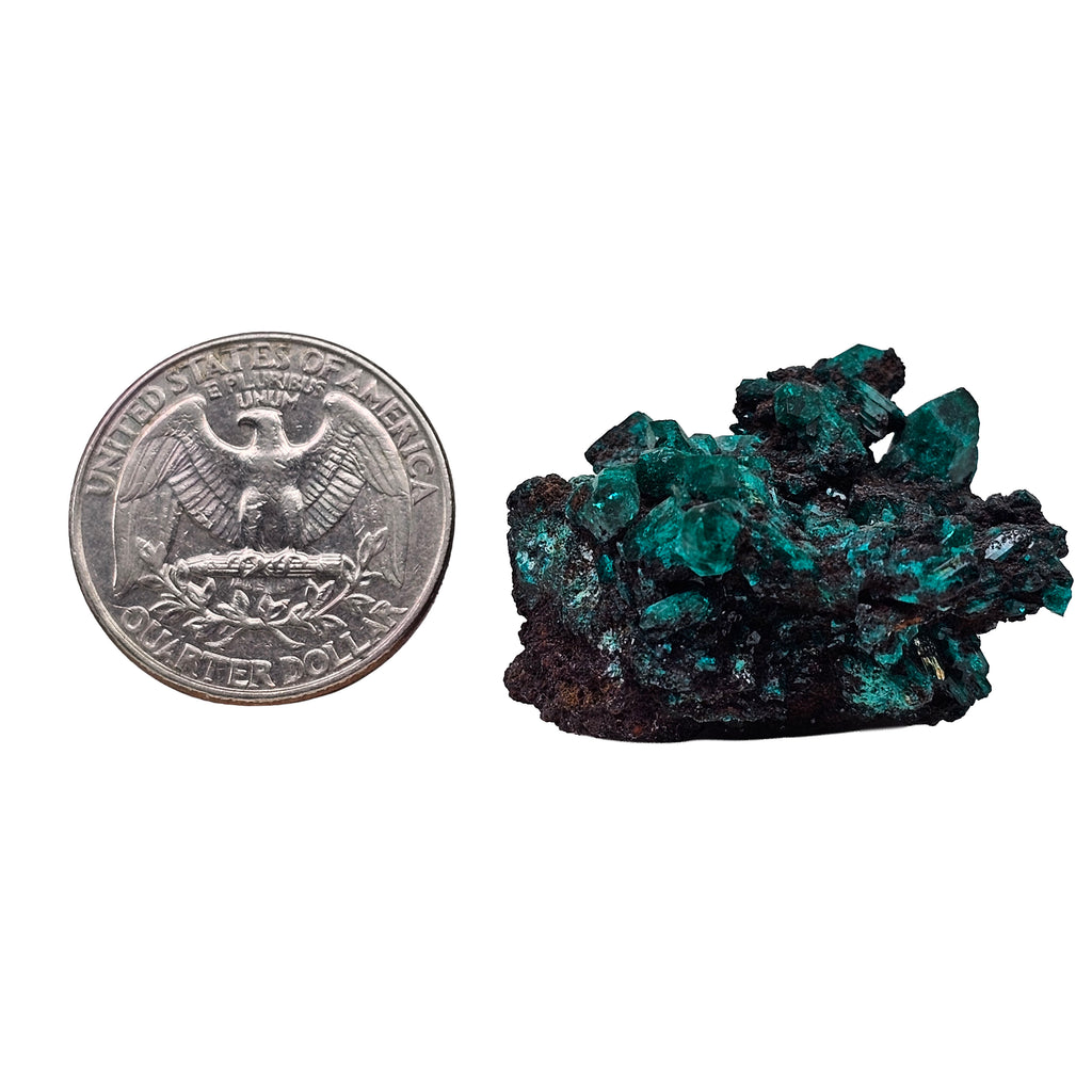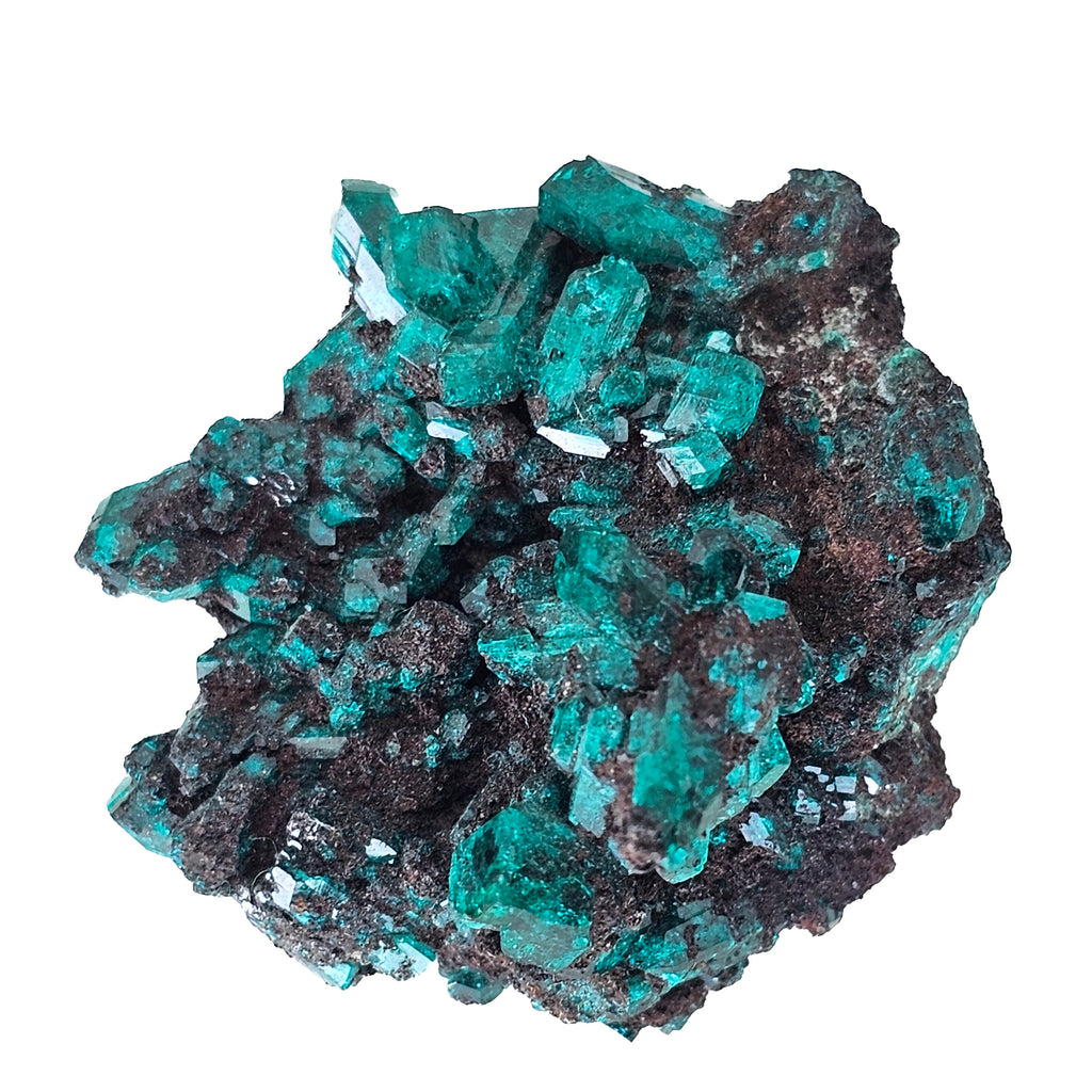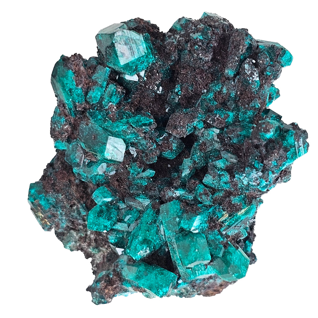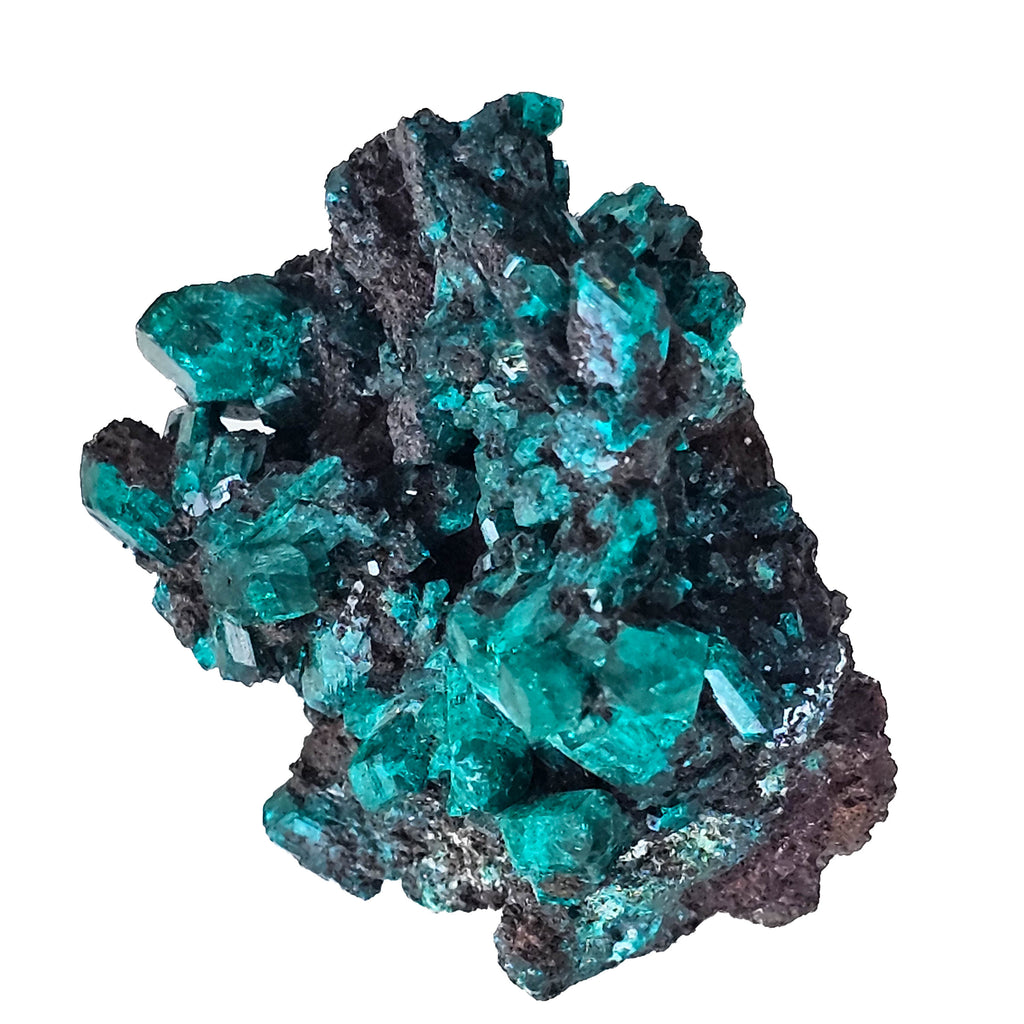 Dioptase is a hydrated copper silicate mineral, and its color comes from copper locked into the crystal structure. It develops in the oxidized parts of copper deposits when copper-rich solutions react with silica and precipitate into open spaces, fractures, and cavities. That process is what gives dioptase its famous jewel-like crystals, even though it is far too soft and brittle for most jewelry use. Congo is one of the most important classic localities for fine dioptase, producing specimens that are sought after for their saturation, crystal form, and natural matrix presentation. This specimen shows that appeal well, with a combination of larger transparent crystals, smaller supporting growth, and a dark host rock that emphasizes the mineral’s depth of color and natural geometry.