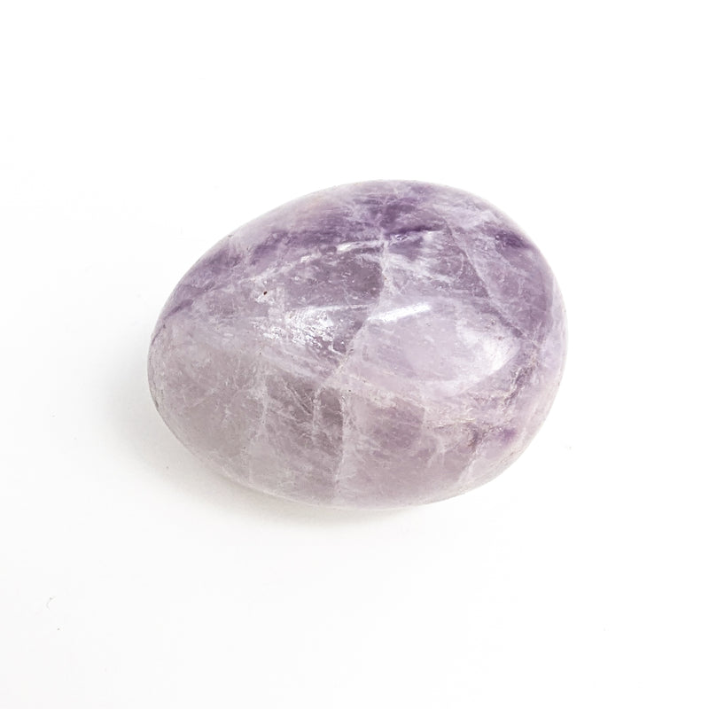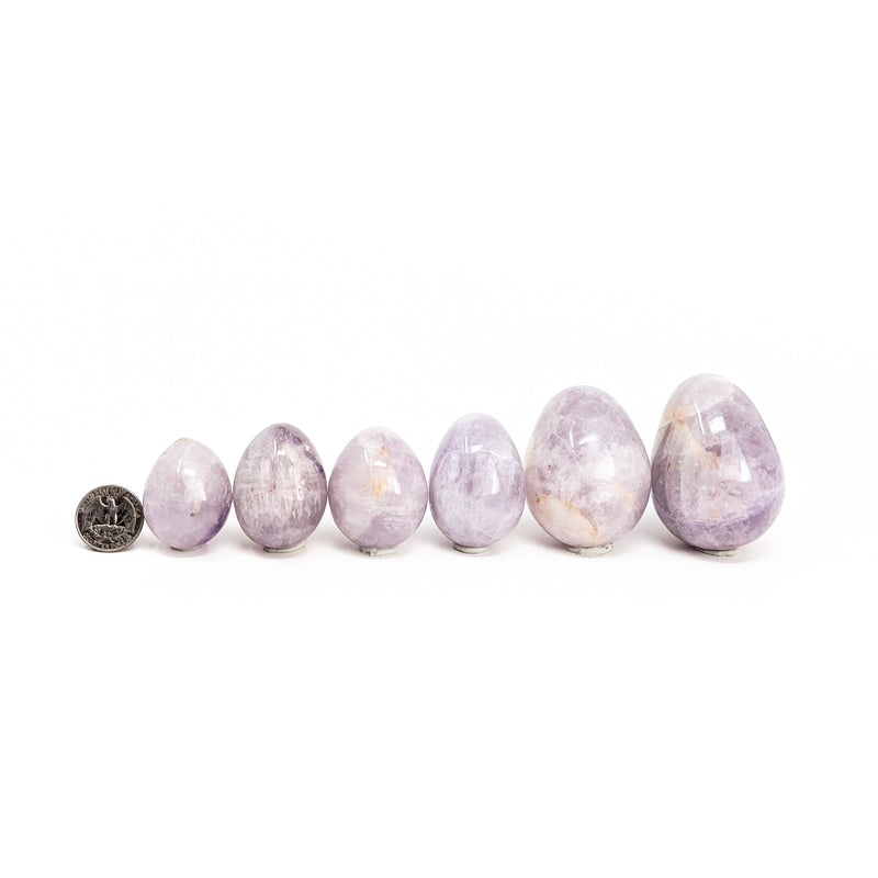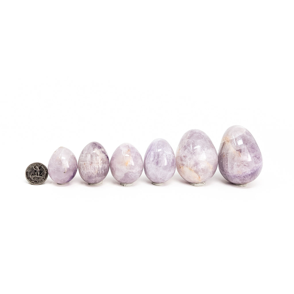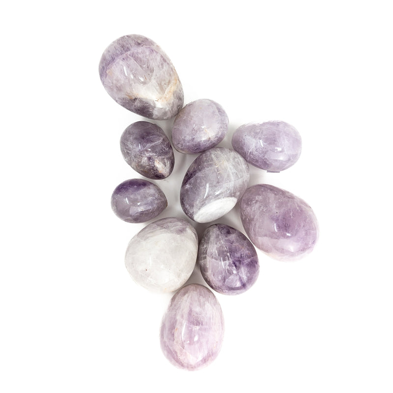 Description: Dream Amethyst is a distinctive variety of quartz (SiO₂) formed through the natural intergrowth of purple amethyst and milky quartz. Its flowing bands of violet, lavender, and white create a mist-like pattern unique to each piece. These eggs are carved and polished in Madagascar, a region known for producing quartz with exceptional clarity and color contrast. The polished egg form emphasizes the stone’s symmetry and natural movement, making it a refined example of Madagascar’s lapidary craftsmanship.