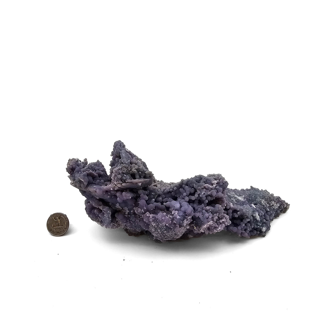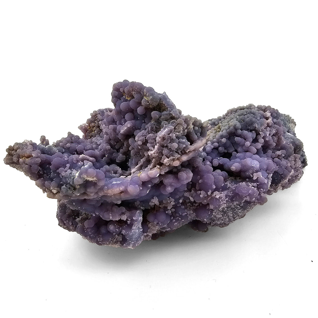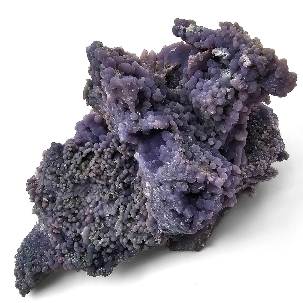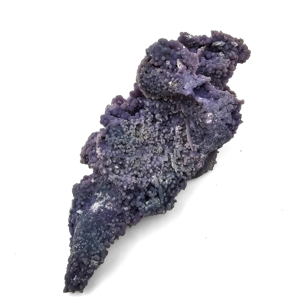 Description: This one of a kind grape agate specimen has a long, narrow, sculptural form with a strong natural flow from end to end. The surface is covered in tightly packed botryoidal chalcedony in soft purple, lavender, and slightly bluish-grey tones, with rounded spheres ranging from tiny sugary druse to larger grape-like bubbles. Some areas rise into folded ridges and clustered mounds, while other sections narrow into pointed extensions, giving the piece a more dramatic and directional shape than the usual compact grape agate clusters.