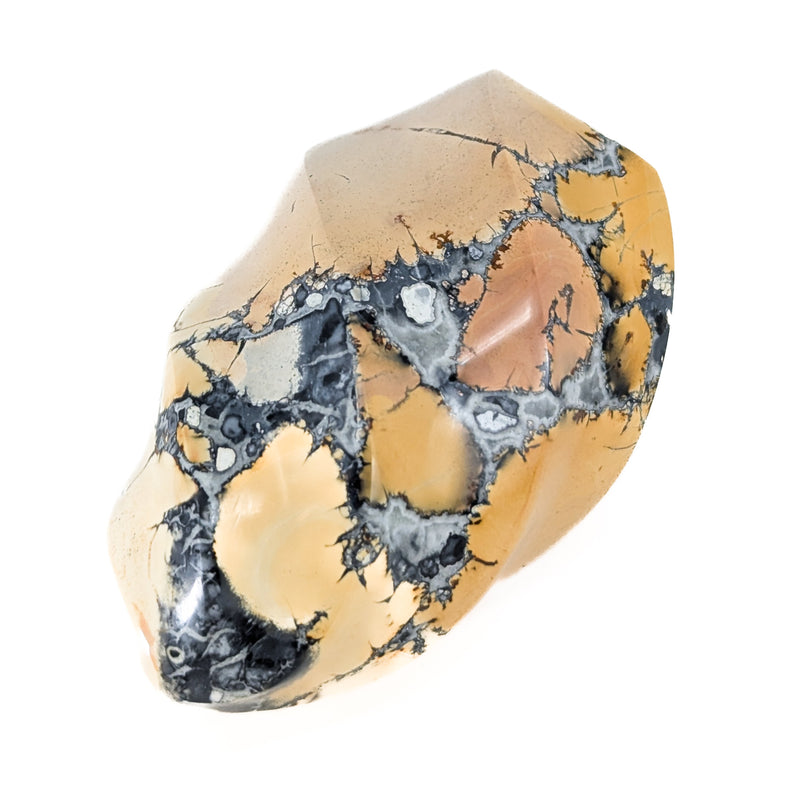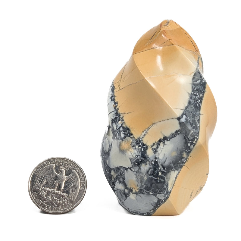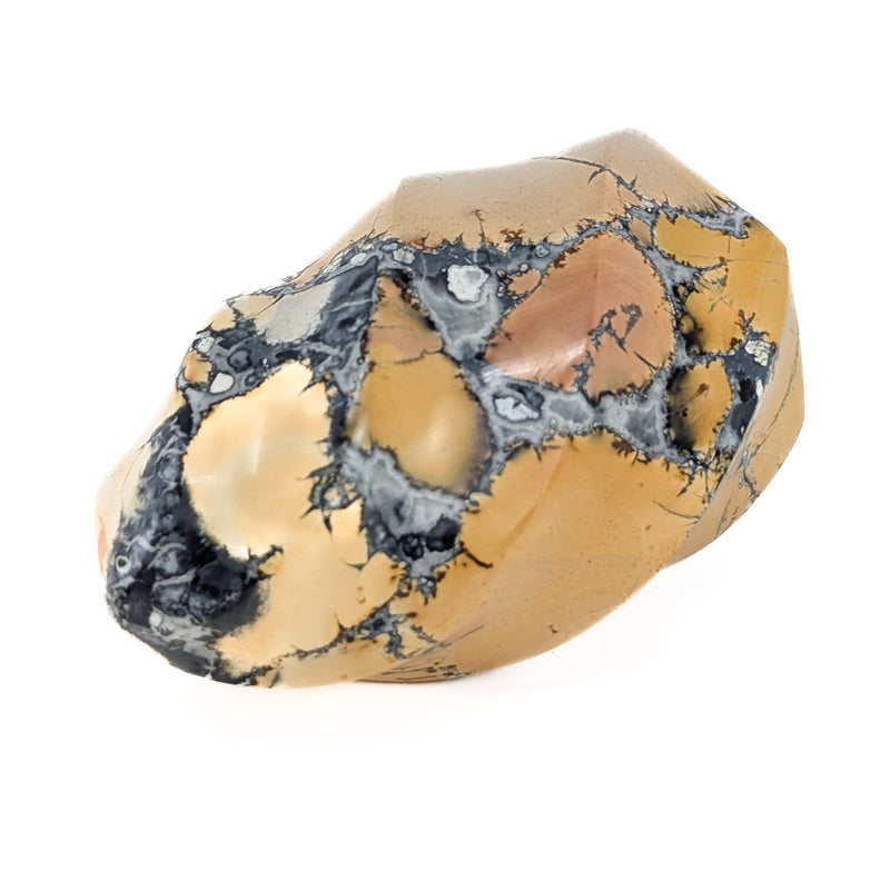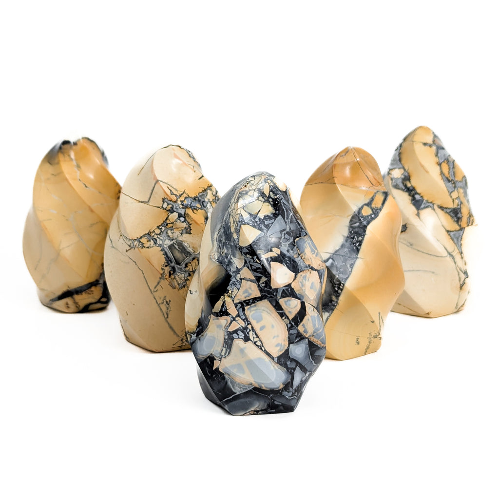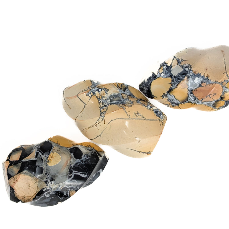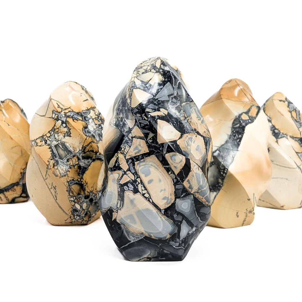 Description: This Maligano Jasper flame from Indonesia is a fiery fusion of color, contrast, and geological storytelling. Polished into a dynamic flame shape, each piece reveals intricate landscapes of brecciated patterns—golden yellows, steel blues, soft grays, and rusty oranges, all crisscrossed by natural veins of silver-gray agate. What makes Maligano Jasper truly exceptional is its formation: a brecciated jasper cemented by agate, formed through tectonic upheaval and ancient hydrothermal processes in the volcanic soils of Sulawesi. The result is a stone that looks like a miniature abstract painting carved by the Earth itself.