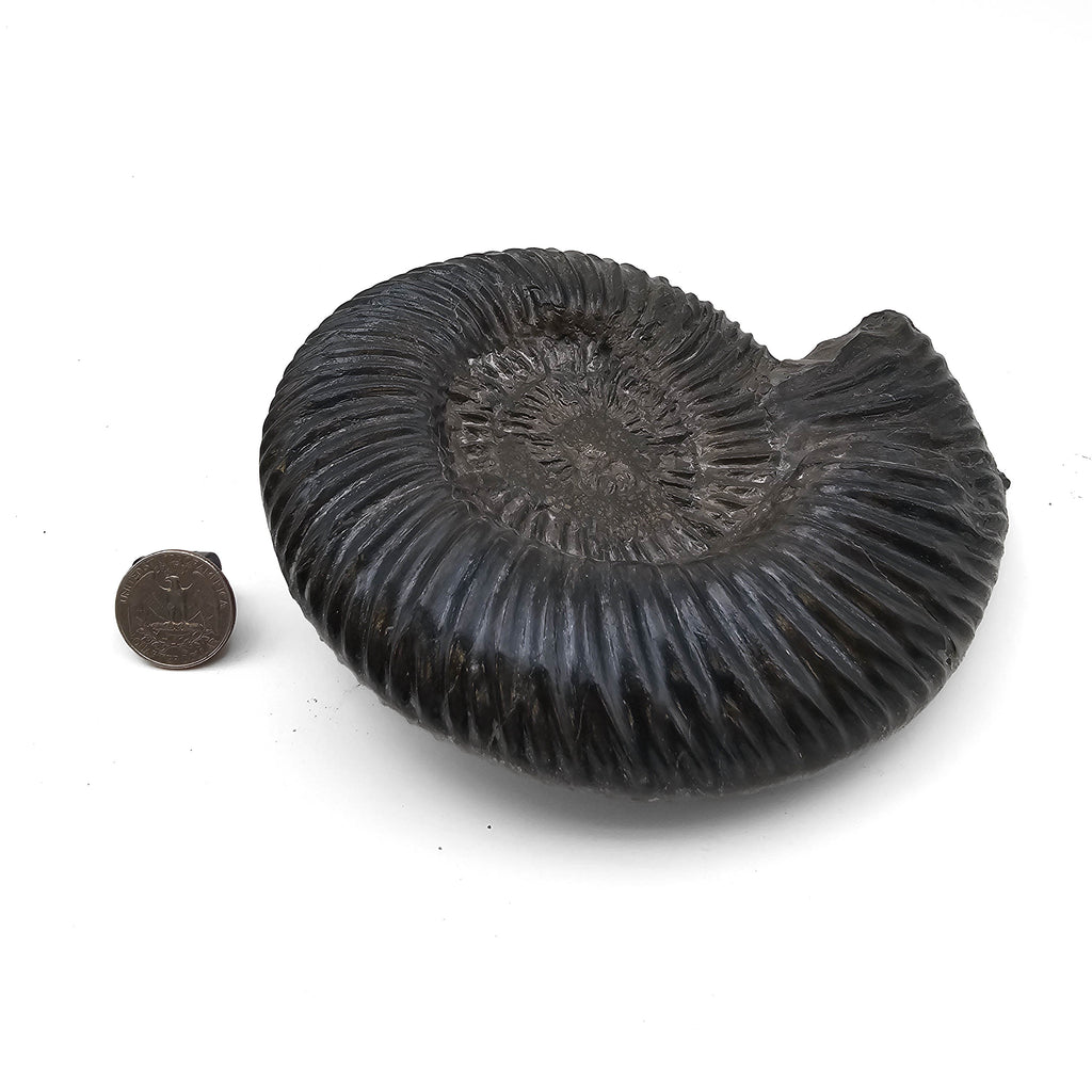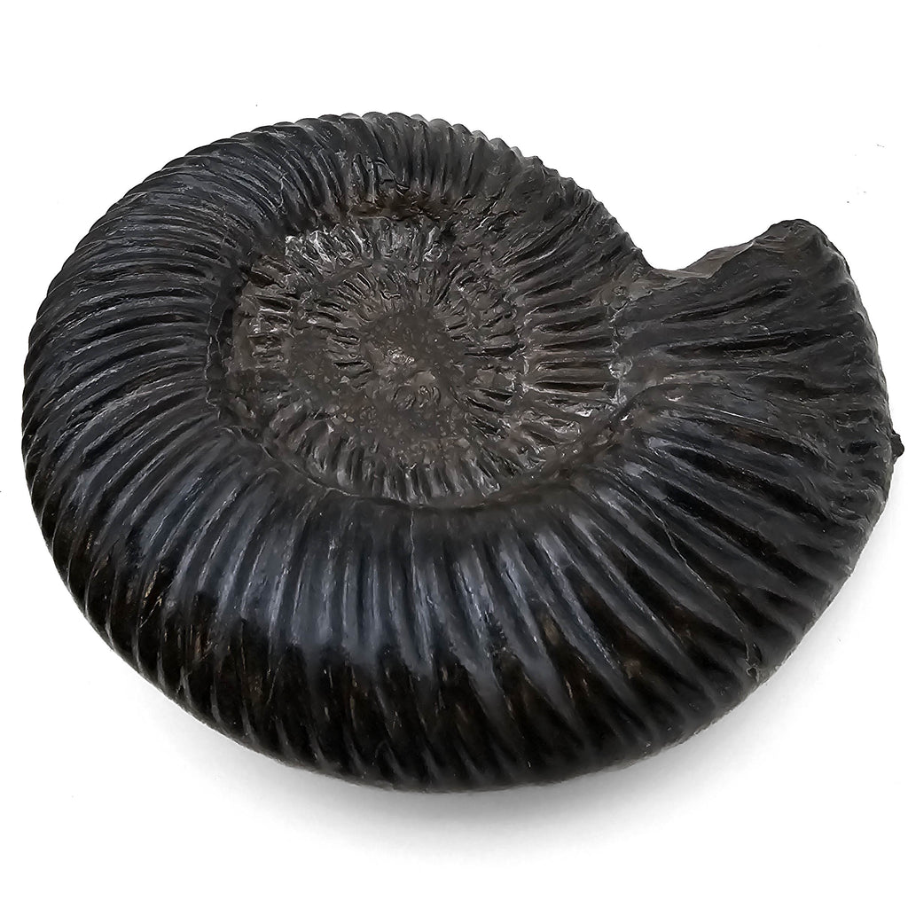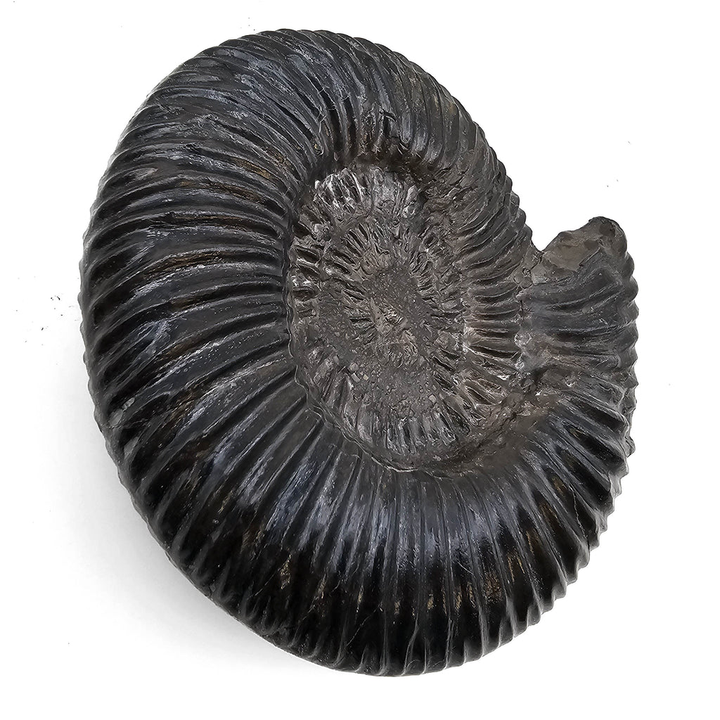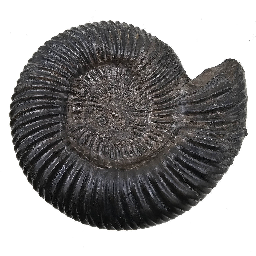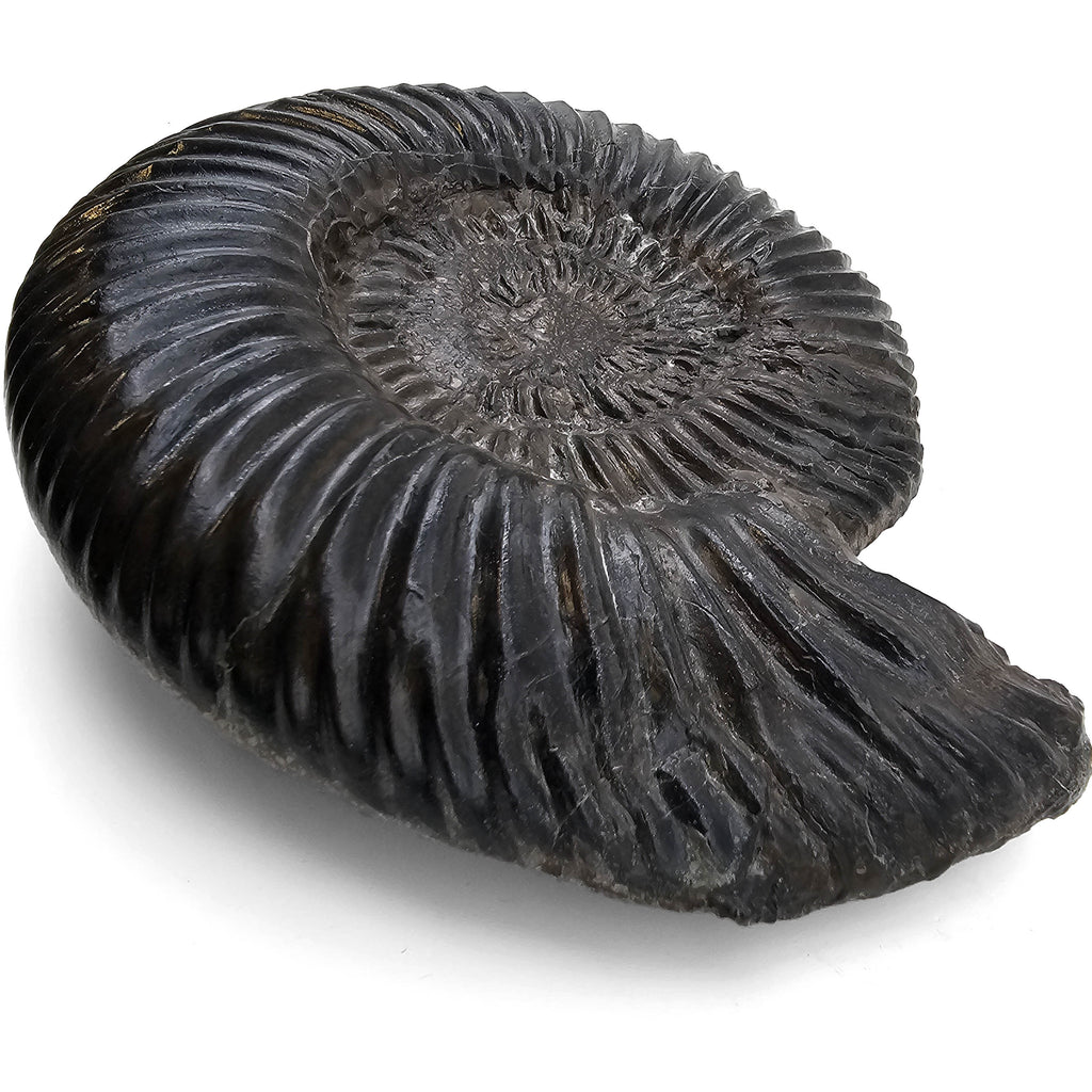 Description: This one of a kind Parkinsonia ammonite fossil from Germany has a bold coiled form with deep, raised ribbing across the shell. The dark black to charcoal surface gives the fossil strong contrast, showing off the ridges, whorl shape, and preserved ammonite structure clearly. The specimen comes from the Parkinsoni Zone of the Upper Bajocian, a Middle Jurassic layer known for ammonites that help geologists date marine rock beds with impressive precision.