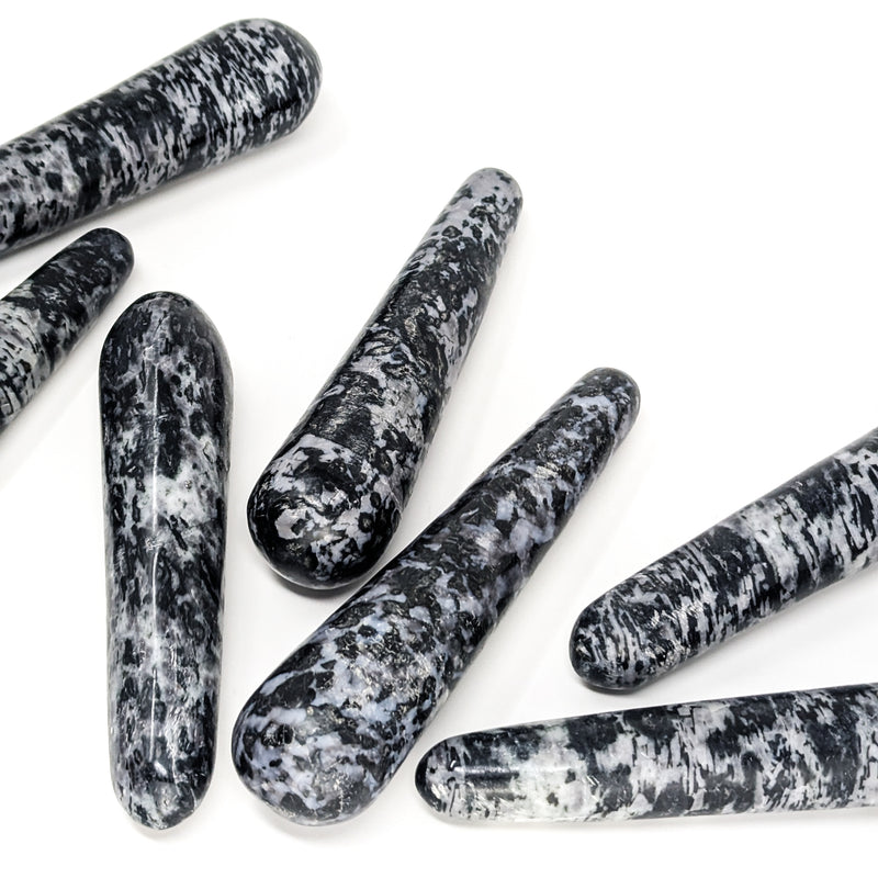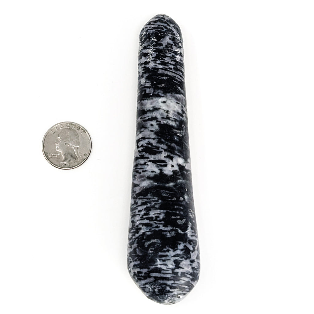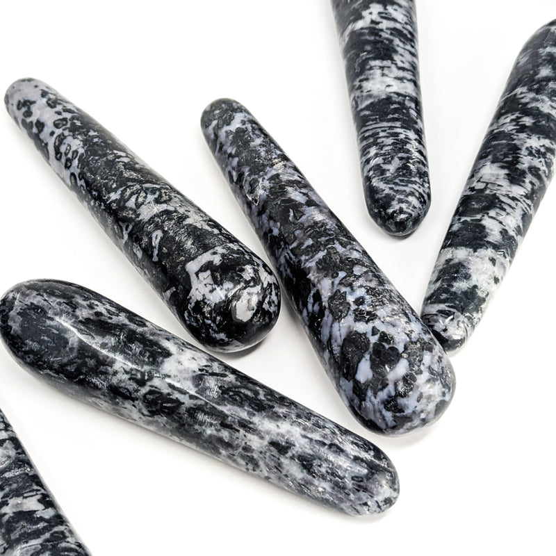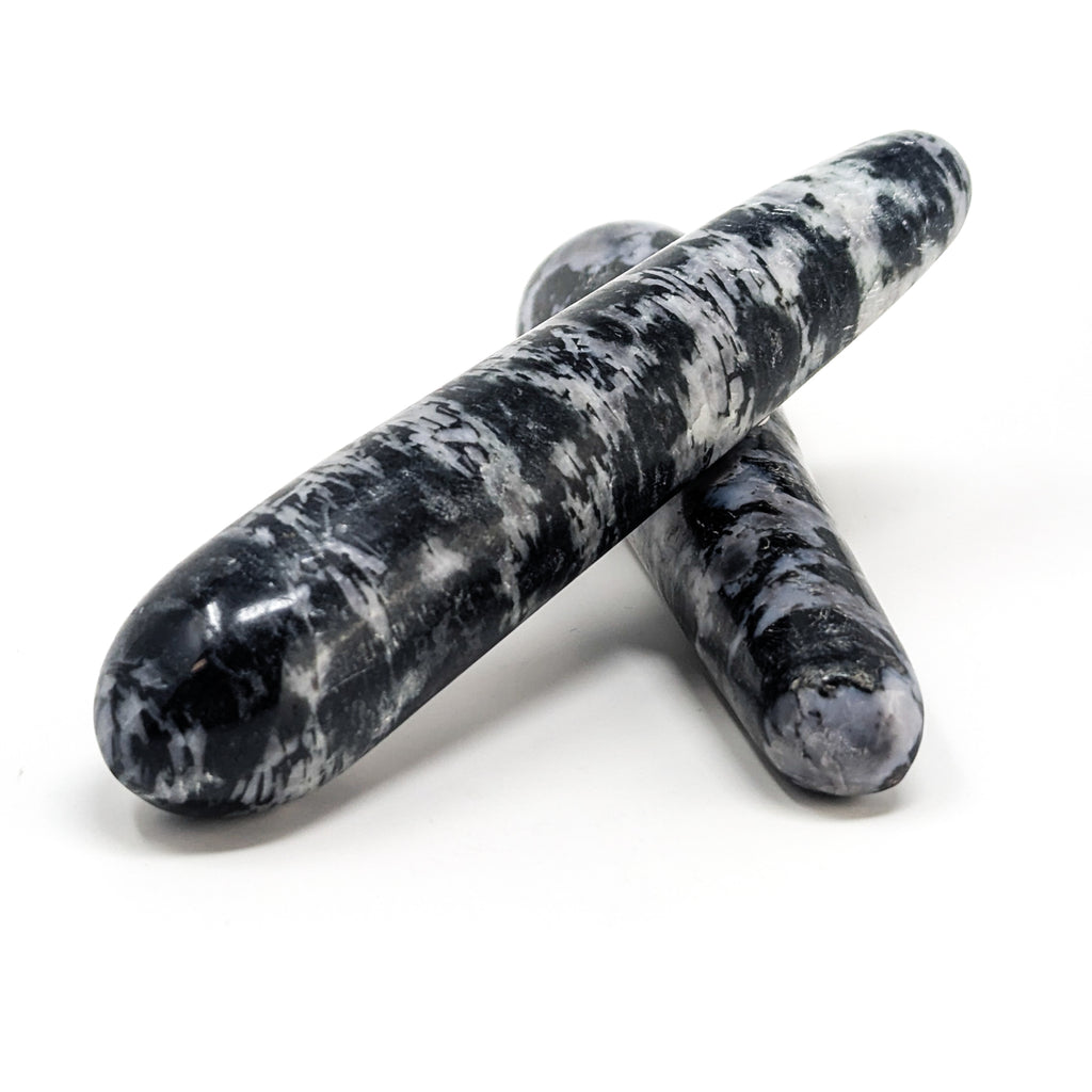 Description: This Merlinite Massage Wand from Madagascar is a striking fusion of deep mystery and natural elegance. Composed of dendritic opal—a black and white stone laced with fern-like inclusions—Merlinite is prized for its moody contrast and mesmerizing patterns. Each wand is smoothly polished and shaped for use in energy work, body massage, or meditation, allowing the stone’s metaphysical and tactile qualities to shine through.