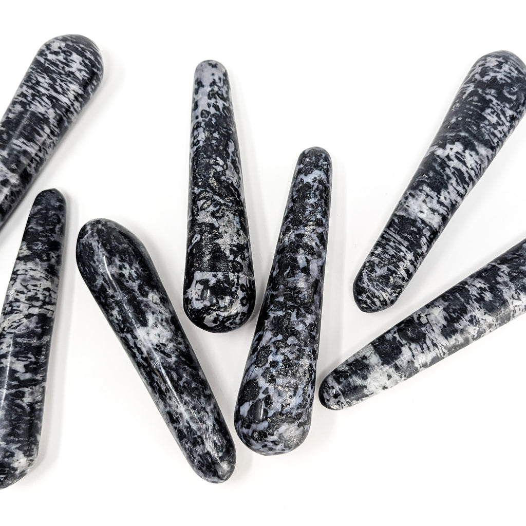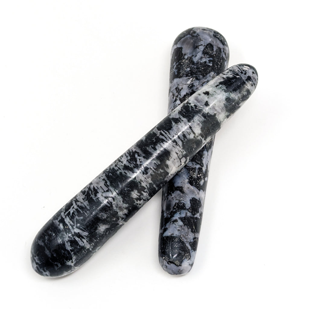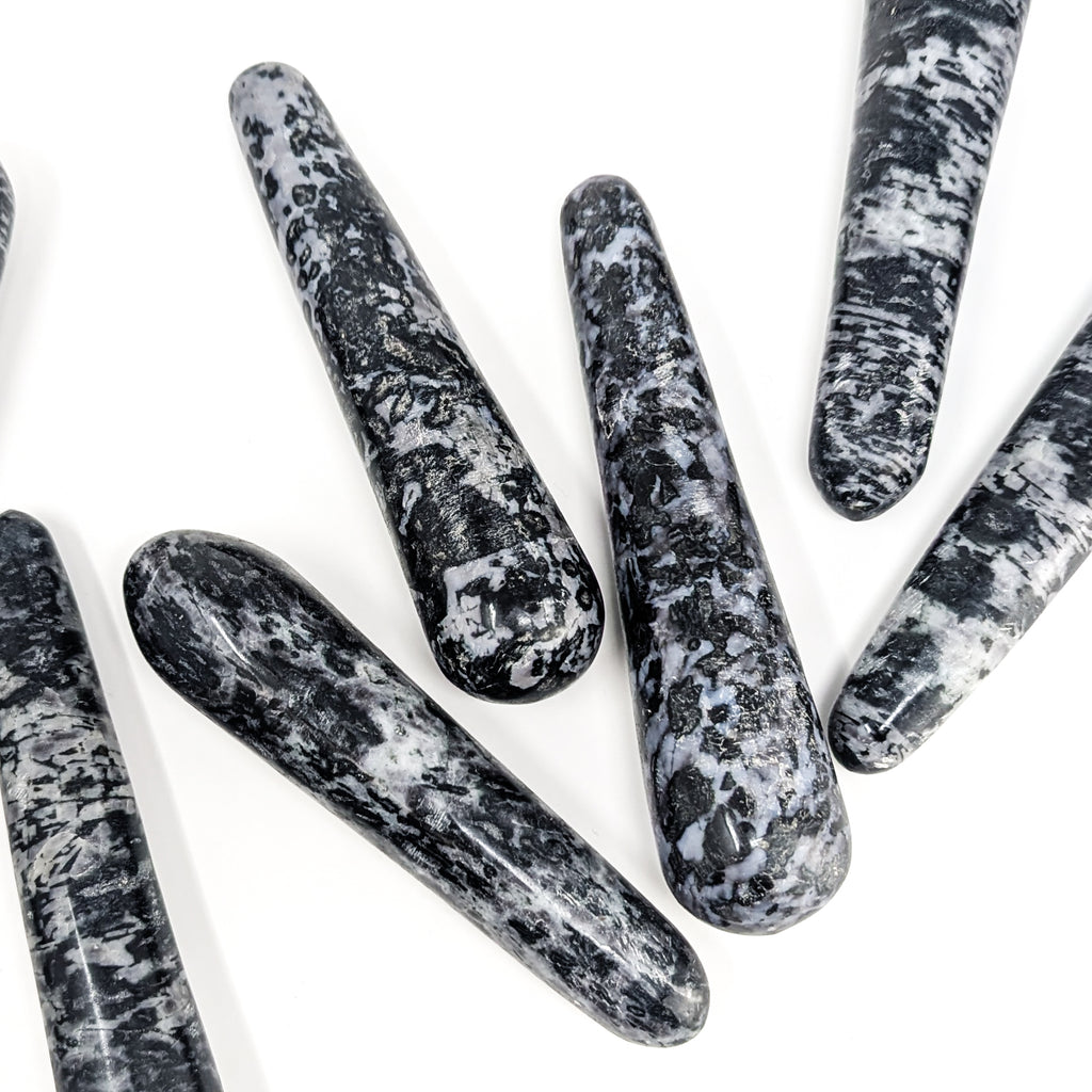 Description: This Merlinite Massage Wand from Madagascar is a striking fusion of deep mystery and natural elegance. Composed of dendritic opal—a black and white stone laced with fern-like inclusions—Merlinite is prized for its moody contrast and mesmerizing patterns. Each wand is smoothly polished and shaped for use in energy work, body massage, or meditation, allowing the stone’s metaphysical and tactile qualities to shine through.