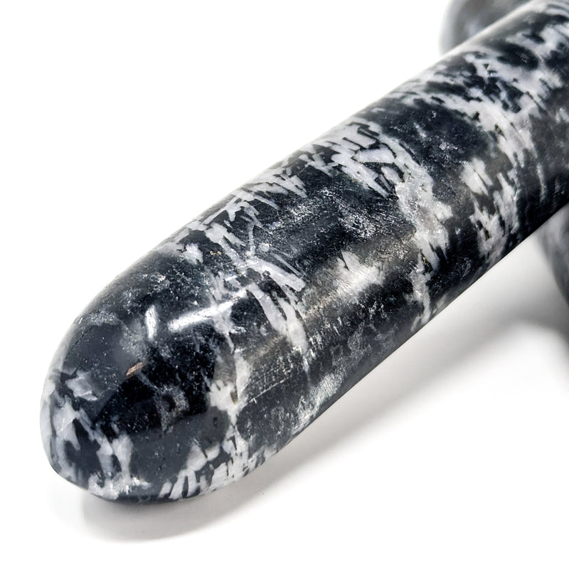 Metaphysically, Merlinite is said to connect the spiritual and earthly realms, making it a favorite among those practicing shadow work, intuition development, or ancestral connection. It’s believed to help uncover hidden truths, balance duality, and awaken inner magic. Whether you use it for healing or display, this Merlinite Massage Wand channels both ancient energy and artistic beauty in one smooth, powerful tool.