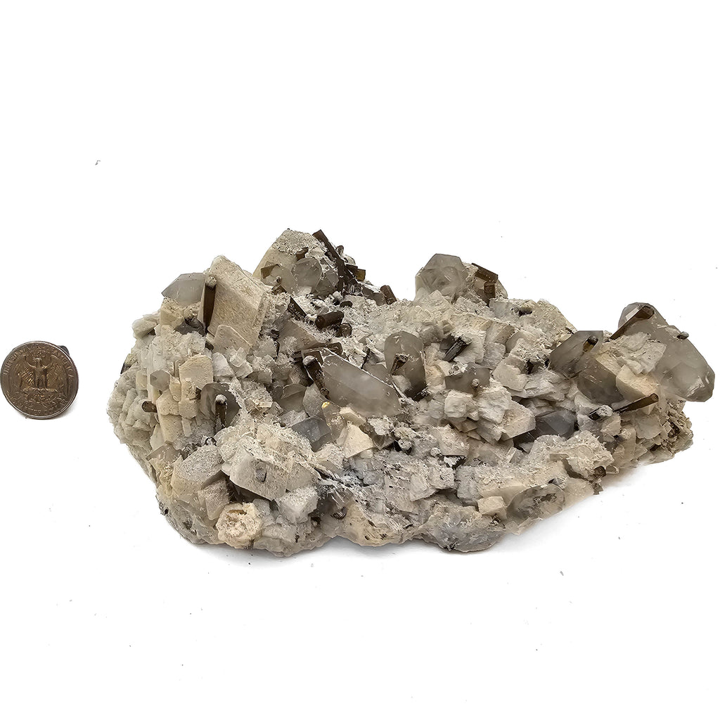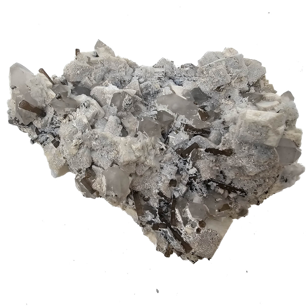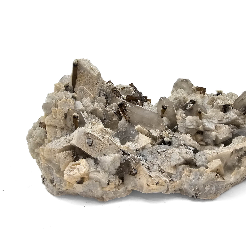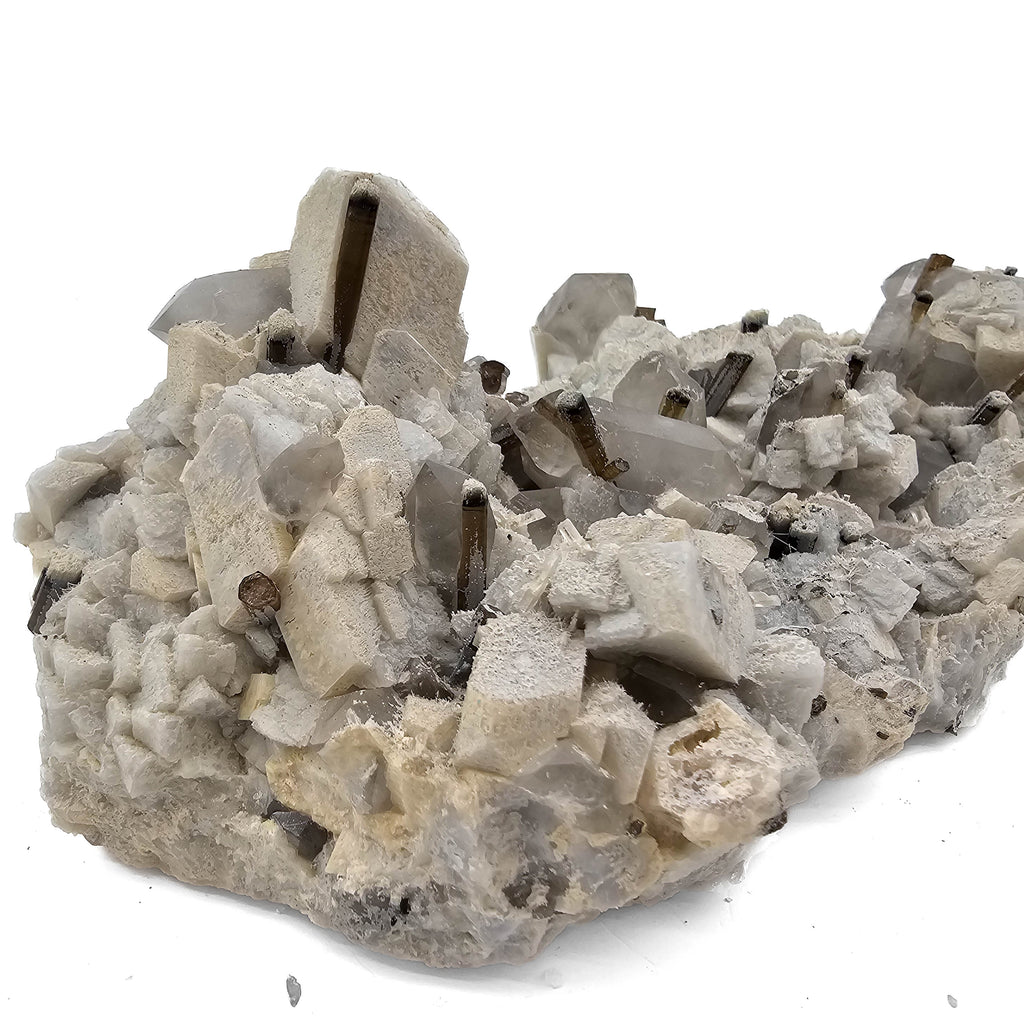Description: This one of a kind Moroccan specimen has a broad, low profile and is packed with mineral texture from end to end. Cream to off-white feldspar crystals form the main body of the piece, many showing sharp blocky faces and stepped growth surfaces. Between them sit clusters of smoky to grey quartz crystals with glassy luster and short terminations, giving the specimen a layered look rather than a single dominant point. Dark brown to nearly black tourmaline crystals rise throughout the matrix as stout prismatic rods, some standing upright and others partly enclosed by later mineral growth.
