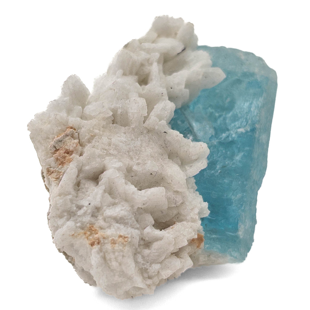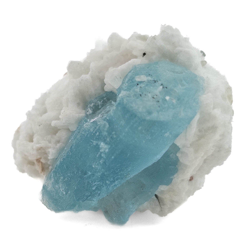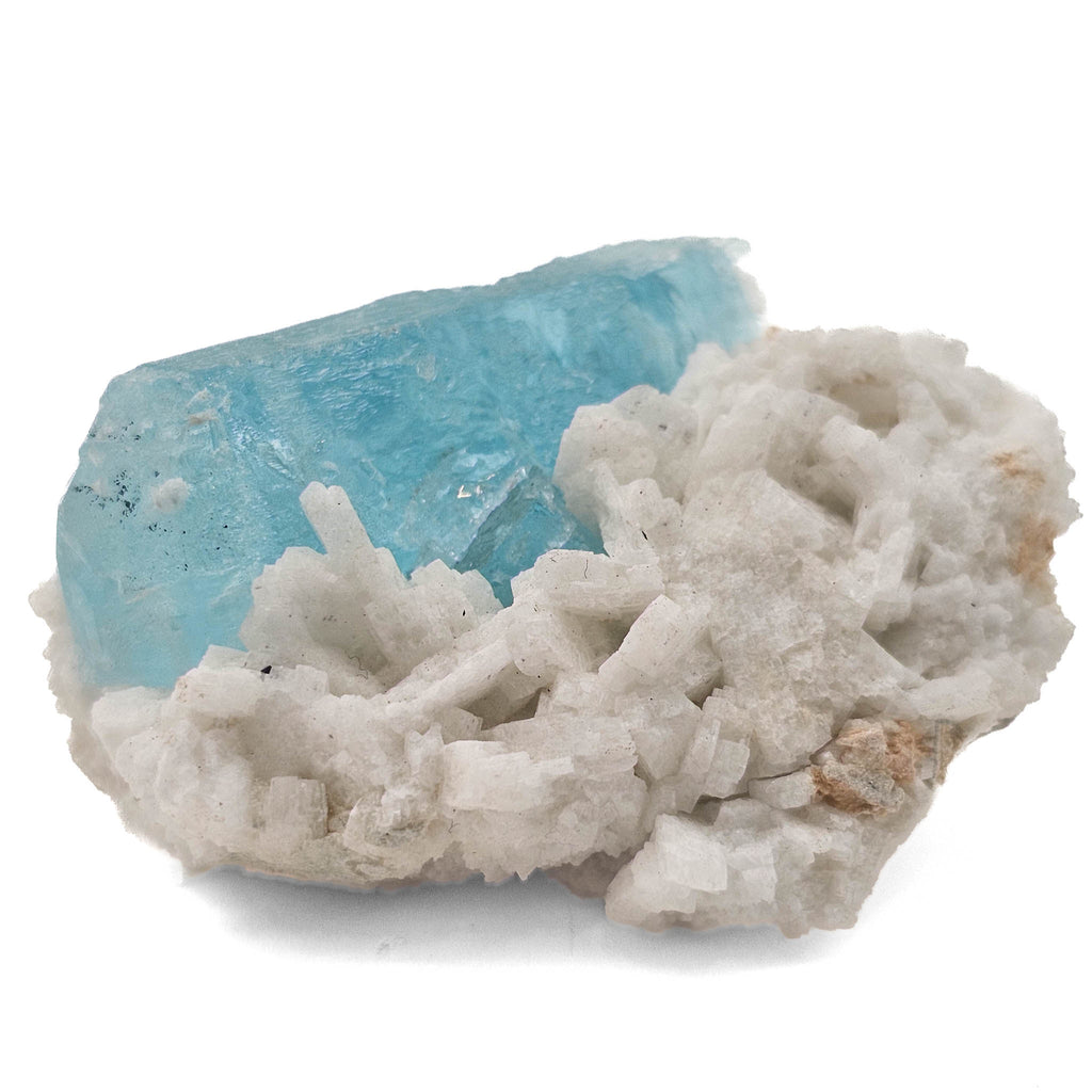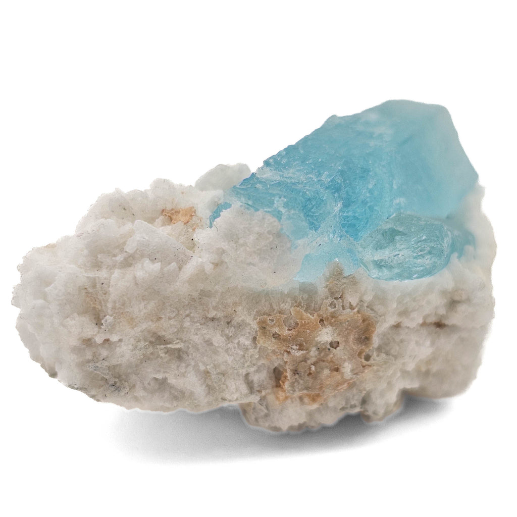 Formed within granitic pegmatites, this aquamarine grew from late-stage, beryllium-rich fluids that infiltrated fractures and cavities during the final stages of magma cooling. The surrounding feldspar represents earlier crystallization, creating the structural framework into which the aquamarine later developed. The relatively isolated crystal and compact matrix indicate a smaller pocket environment rather than a large open cavity, giving the piece a more grounded, natural formation style.