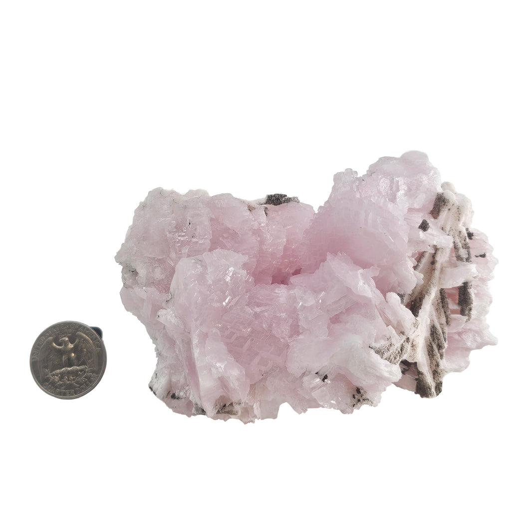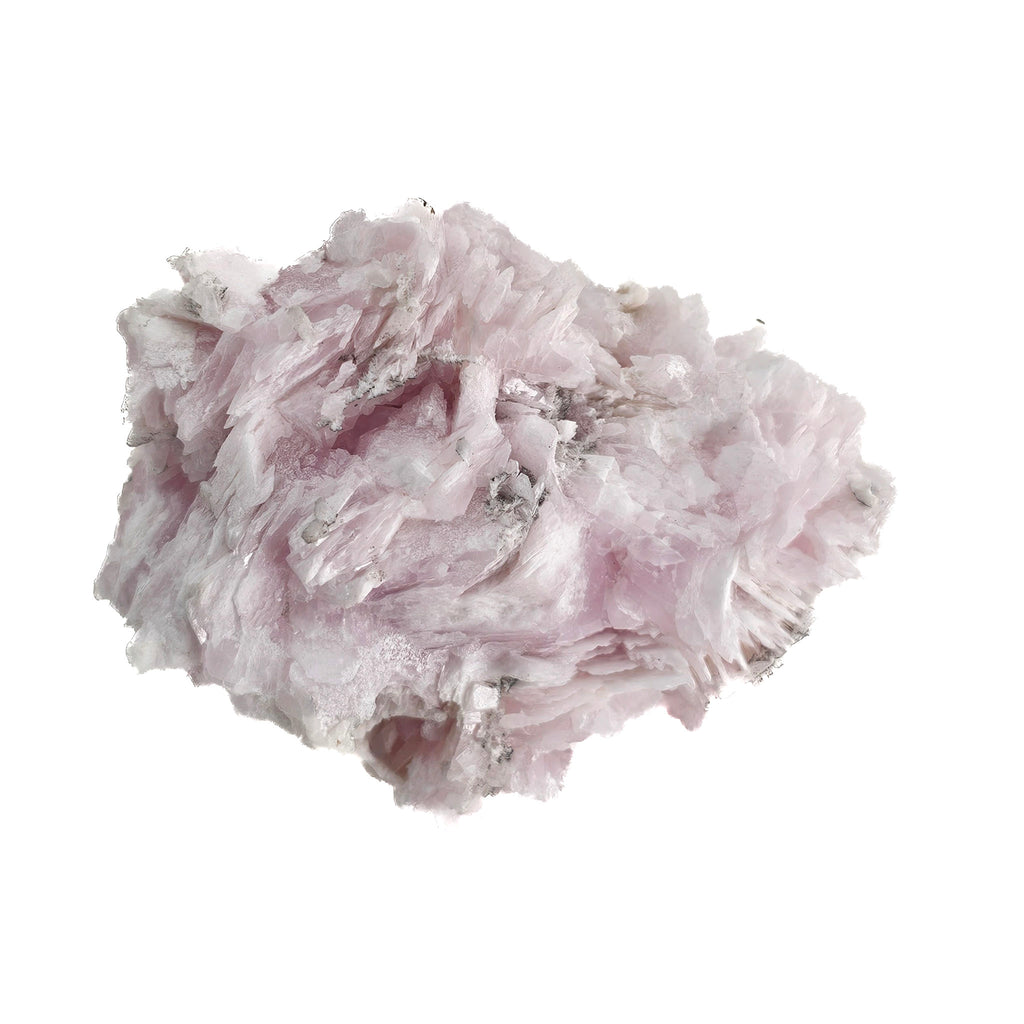 Description: This piece is a soft pink calcite showing a dense cluster of bladed crystals arranged in a rosette-like formation. The crystals are thin, slightly curved, and stacked in layered growth, giving the whole piece a textured, almost floral appearance. The pink color is consistent throughout the interior, with lighter edges and some white calcite overgrowths. There are also small dark inclusions scattered through parts of the piece, along with a few contrasting white, elongated secondary crystals adding depth and variation.