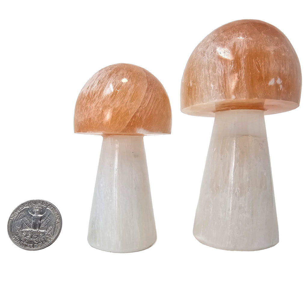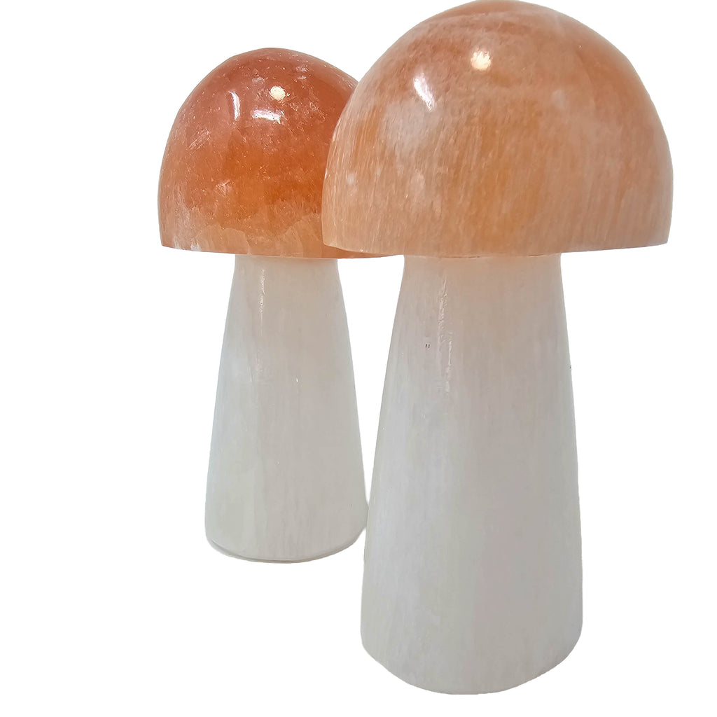 Description: This carved mushroom features a white selenite stem with a contrasting red selenite cap, sourced from Morocco. Selenite is a crystalline variety of gypsum known for its fibrous structure, silky luster, and natural translucence. The white portion forms in clean evaporite deposits, while the red coloration occurs when iron oxide inclusions stain the mineral during growth. Morocco is one of the world’s most significant producers of high-quality selenite, often yielding material with strong chatoyancy and soft internal glow.