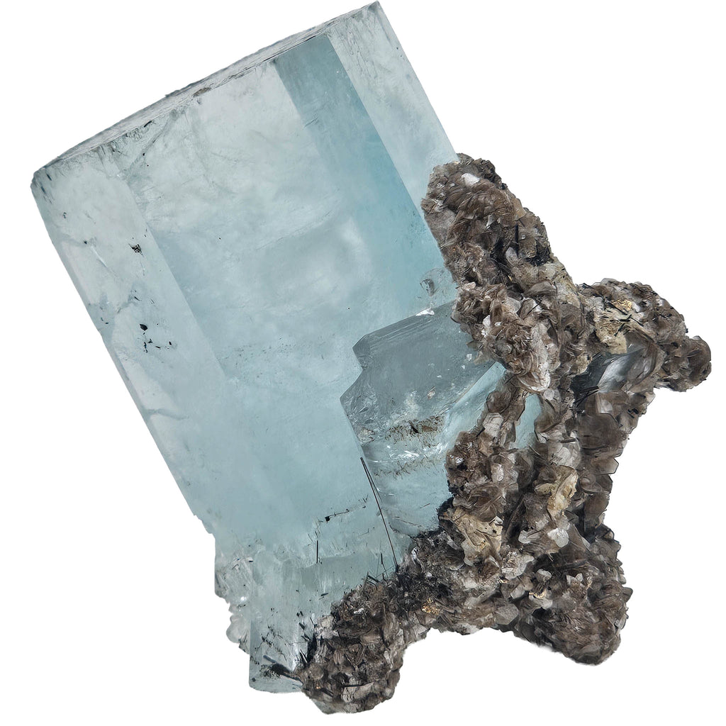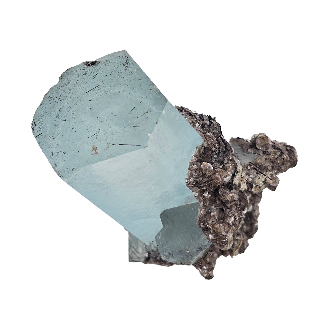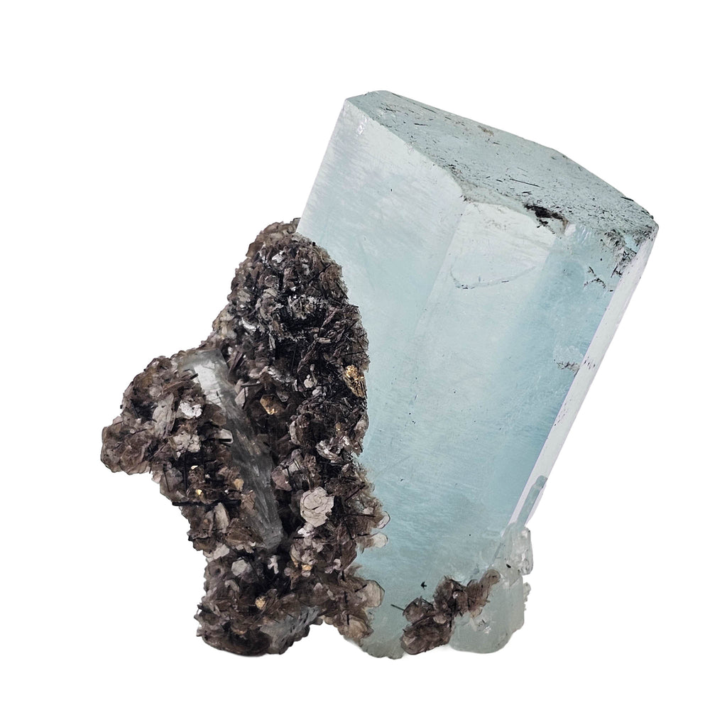 Description: This aquamarine specimen is a more defined and higher-grade example, featuring a thick, well-formed hexagonal prism with a flat termination. The color is a clean, pale blue with good transparency, allowing light to pass through the crystal and highlight internal zoning and faint veils. The crystal sits naturally on a contrasting matrix of brown mica (likely muscovite), with smaller secondary aquamarine growths attached at the base. The combination of sharp geometry and textured matrix gives the piece strong visual balance.