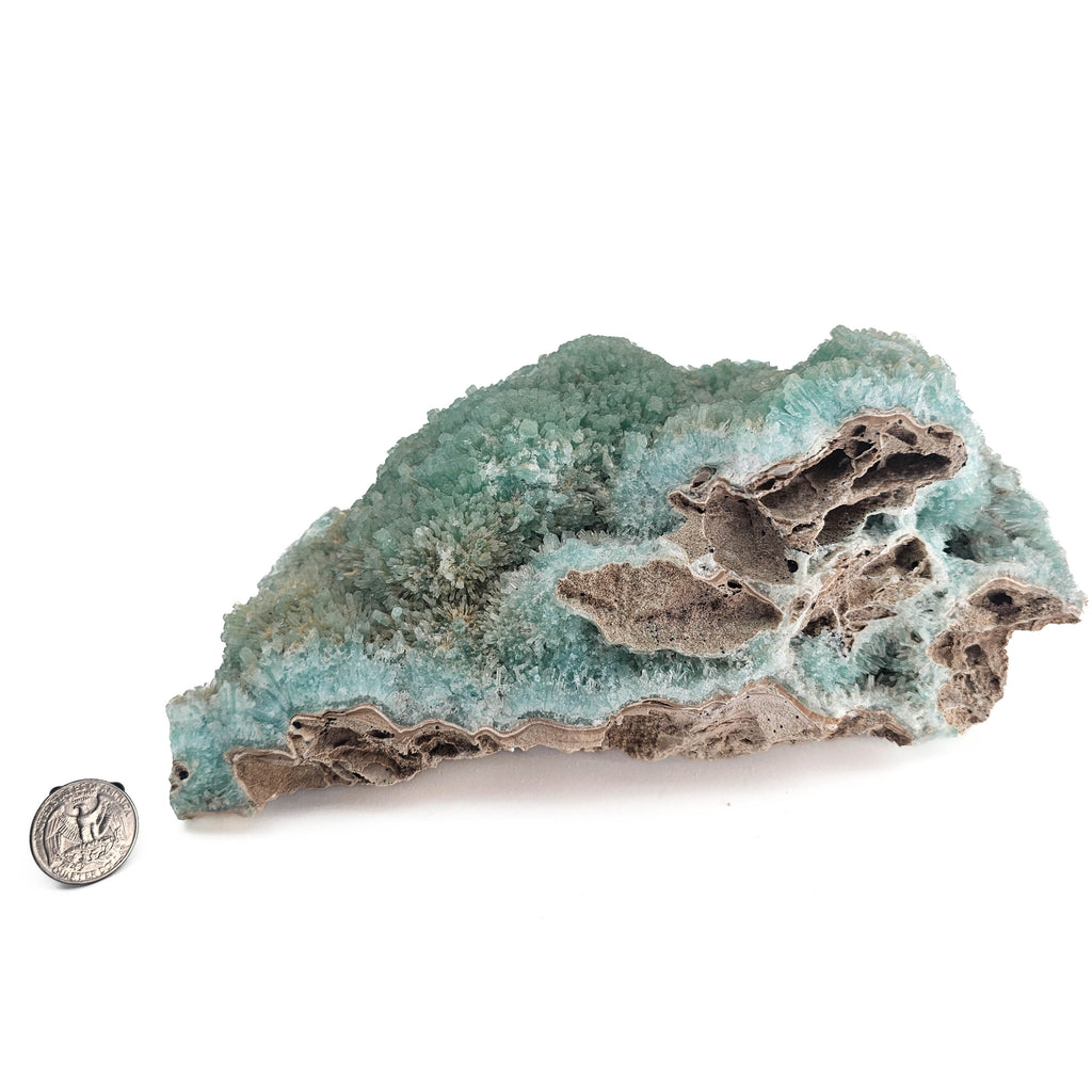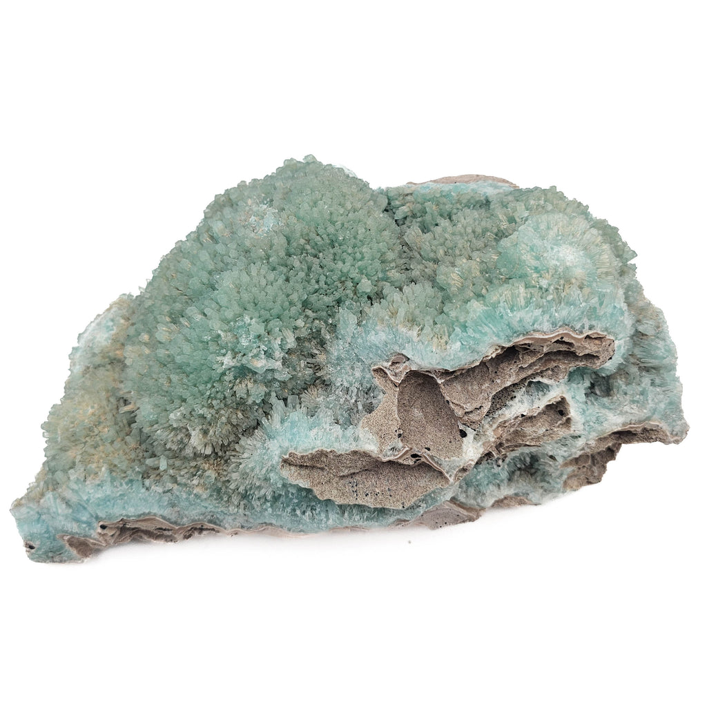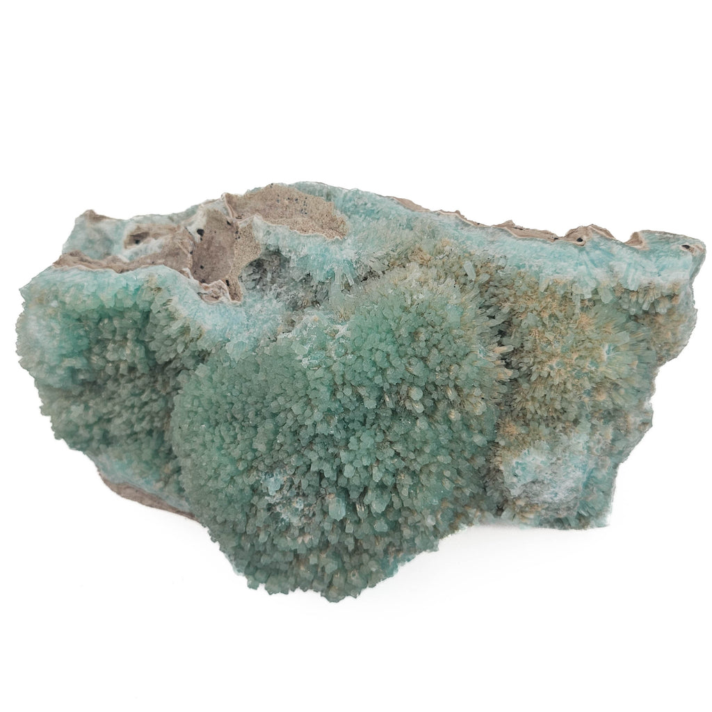Description: This blue aragonite from Pakistan has that tight, rounded growth you see when crystals pack in close and grow outward in all directions. You’ve got these dome-like clusters made up of fine needle-like crystals, giving it a rough, spiky texture up close but a smooth, rounded look from a distance. The color runs from pale blue to a slightly greenish-blue, with some areas showing a bit of tan matrix still attached. It’s not polished or flashy—it’s more of a natural buildup piece, where the structure is what really stands out.