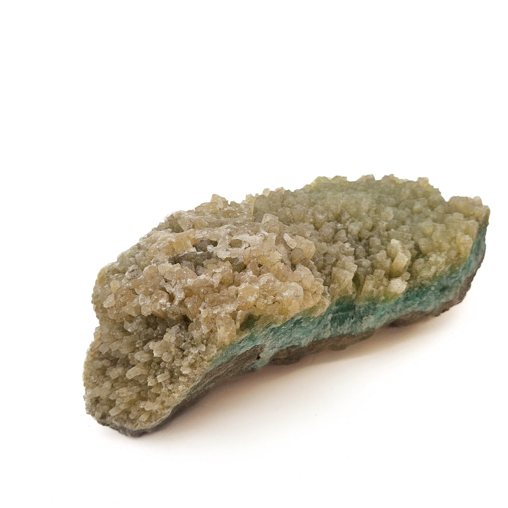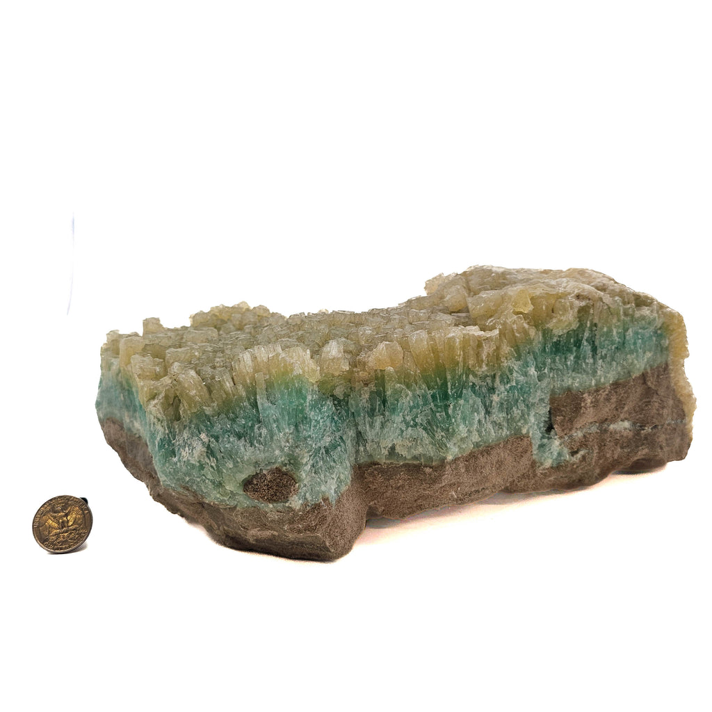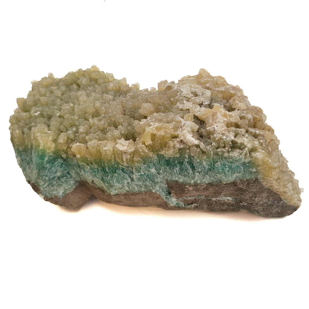 Description: This piece has a more layered look compared to the round, bubbly ones. You’ve got a solid band of blue-green aragonite running through the middle, with tight, needle-like crystals shooting upward and outward. On top of that, there’s a second generation of thicker, blockier crystals in a pale yellow to tan color. It gives the whole thing a stacked look—like one phase grew, then conditions changed and something else started forming right on top. The base is still that rough brown matrix, which helps show how it all built up in place rather than being broken and reattached.