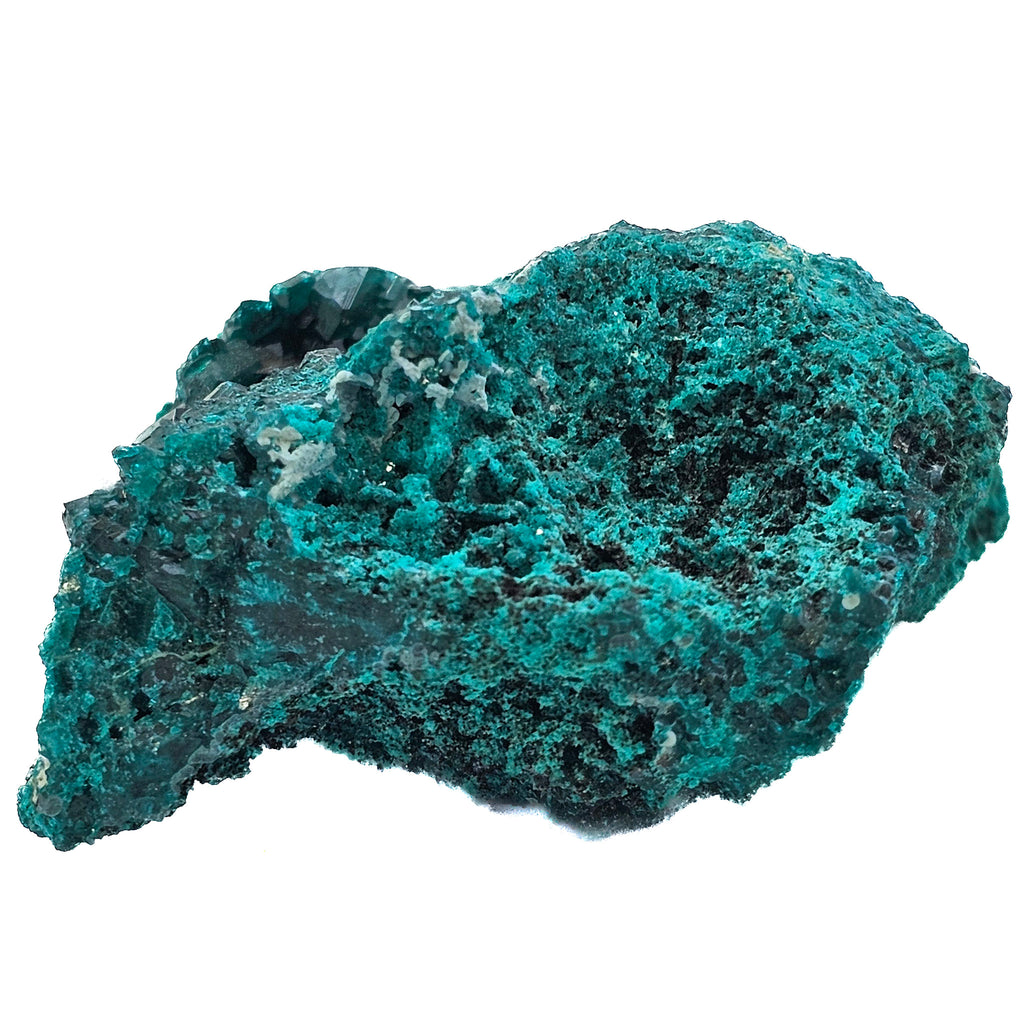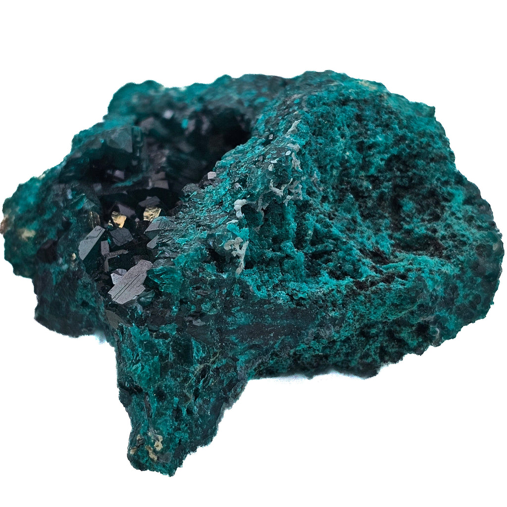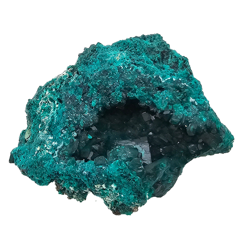 Description: This dioptase specimen from the Renéville Mine shows a classic botryoidal copper-rich matrix coated with dense clusters of deep green crystals lining a natural cavity. The outer surface has that velvety, granular look typical of oxidized copper minerals, while the interior opens into a pocket of well-formed, glassy dioptase crystals. The contrast between the rough exterior and the sharp, reflective crystal faces inside makes this a strong display piece, especially at this size.