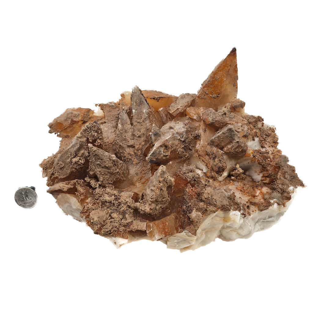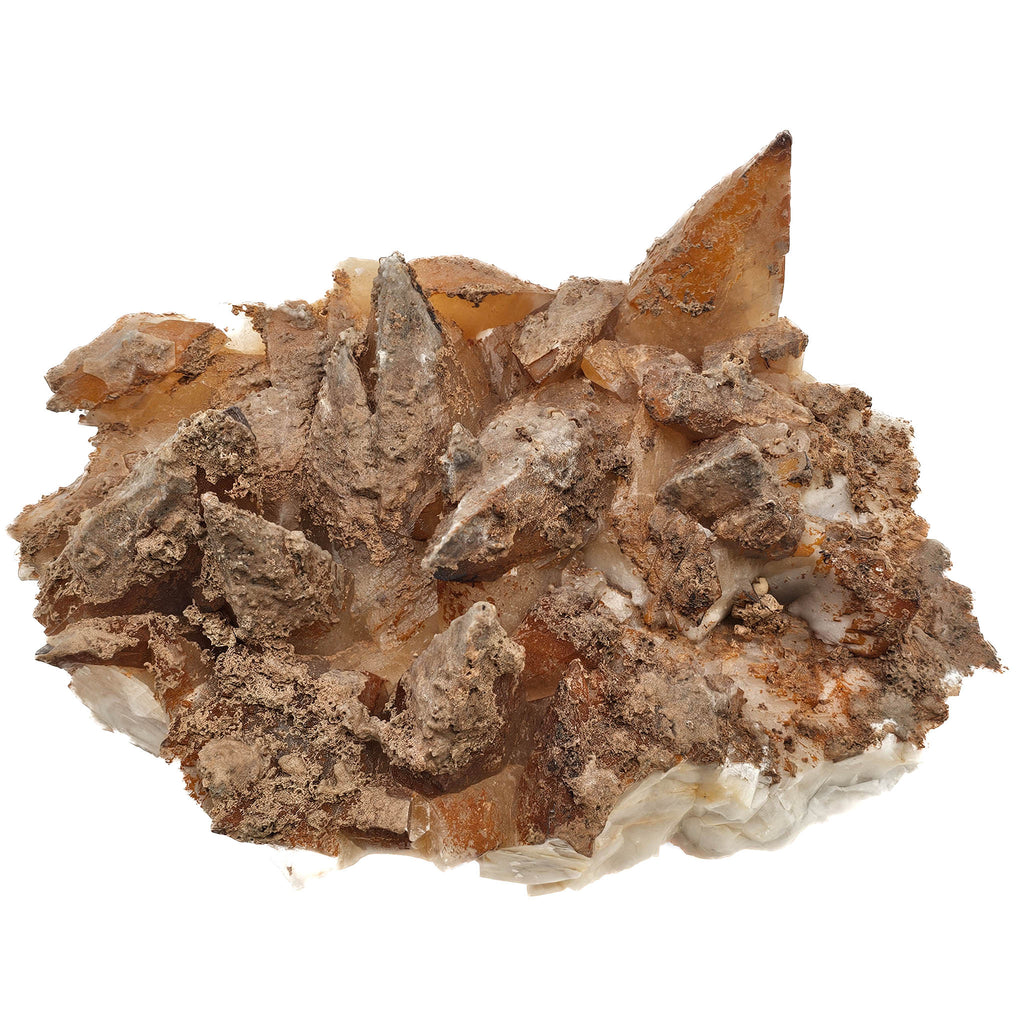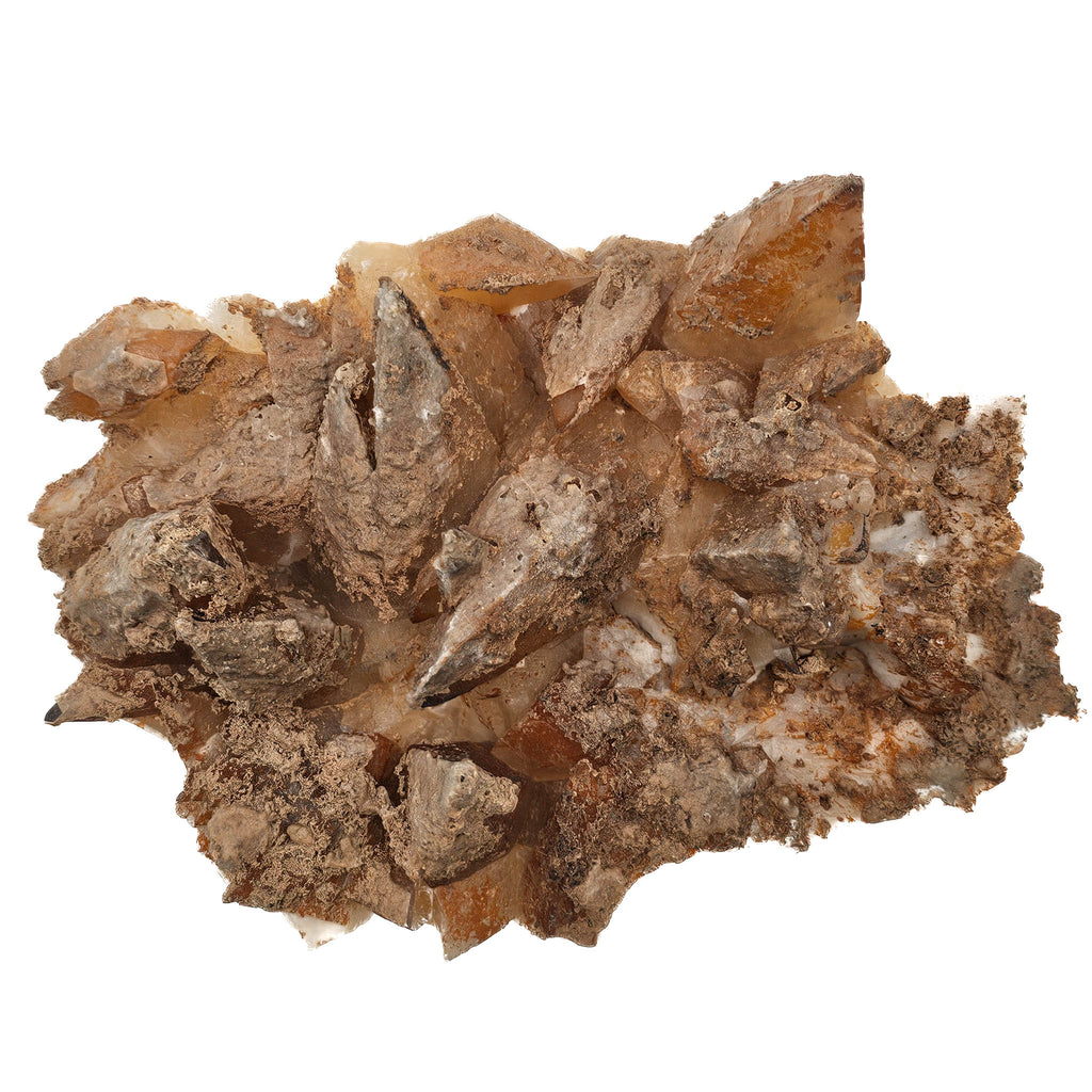 Description: This specimen features classic scalenohedral calcite crystals, commonly referred to as “dogtooth” calcite due to their sharply pointed, elongated triangular forms. The crystals show a warm amber to honey-brown coloration, caused by iron oxide inclusions and surface staining, with some areas retaining a lighter, milky calcite base. These crystals formed in open cavities within a hydrothermal system, where calcium-rich fluids deposited calcite over time, allowing the crystals to grow freely into well-defined, pointed structures. The rough, earthy coating seen on parts of the specimen reflects later-stage mineralization or sediment contact during formation.