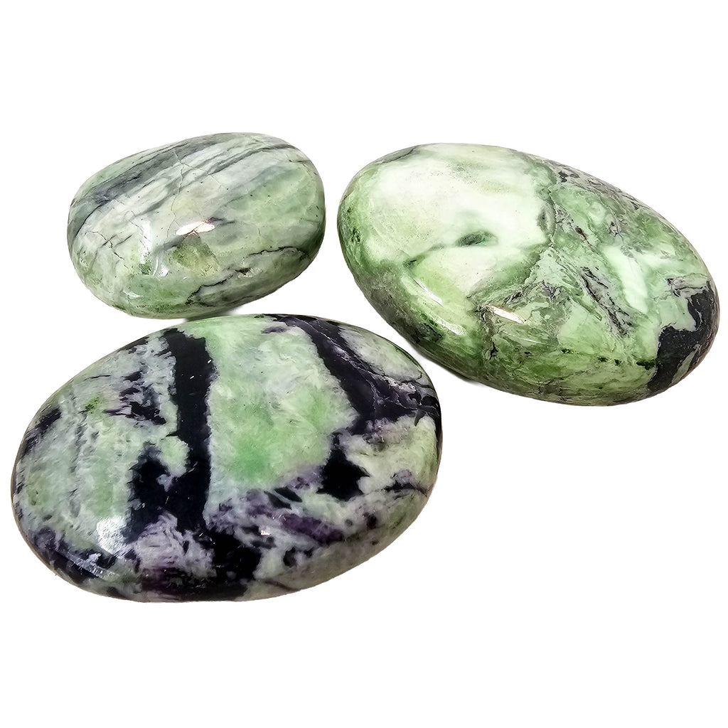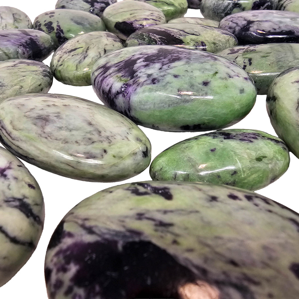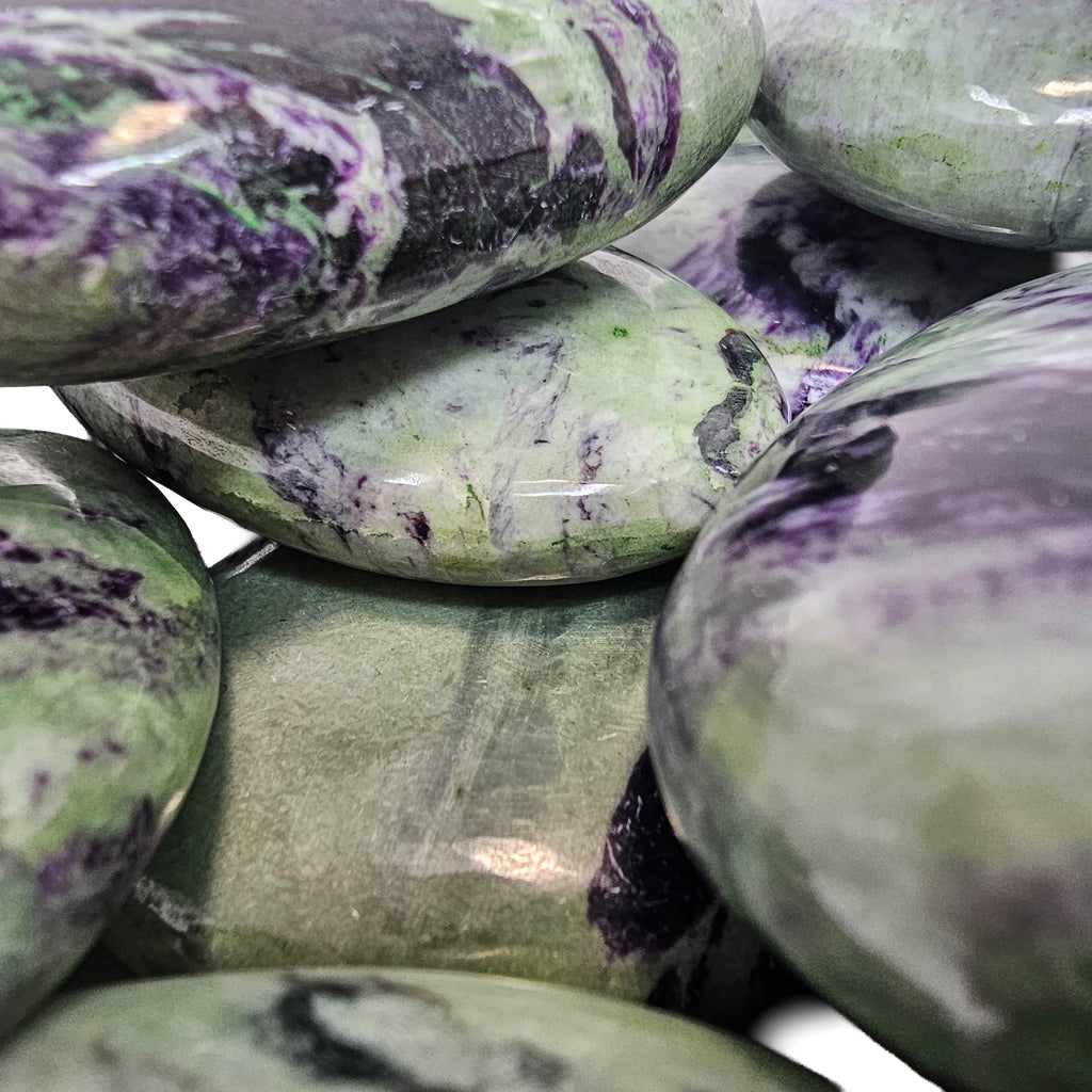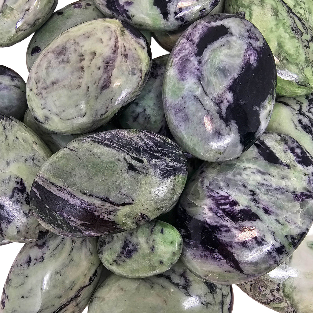 Description: Kammererite is a chromium-rich variety of clinochlore from the chlorite mineral group. These palmstones from India show a mix of purple and green tones, often with a subtle reflective shimmer caused by the mineral’s layered crystal structure. Polishing the stone into a palmstone shape highlights the natural color contrast and makes the surface smooth and comfortable to hold.