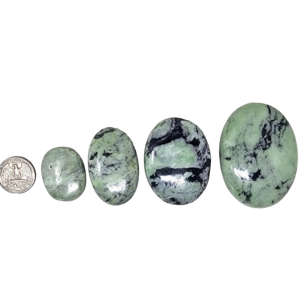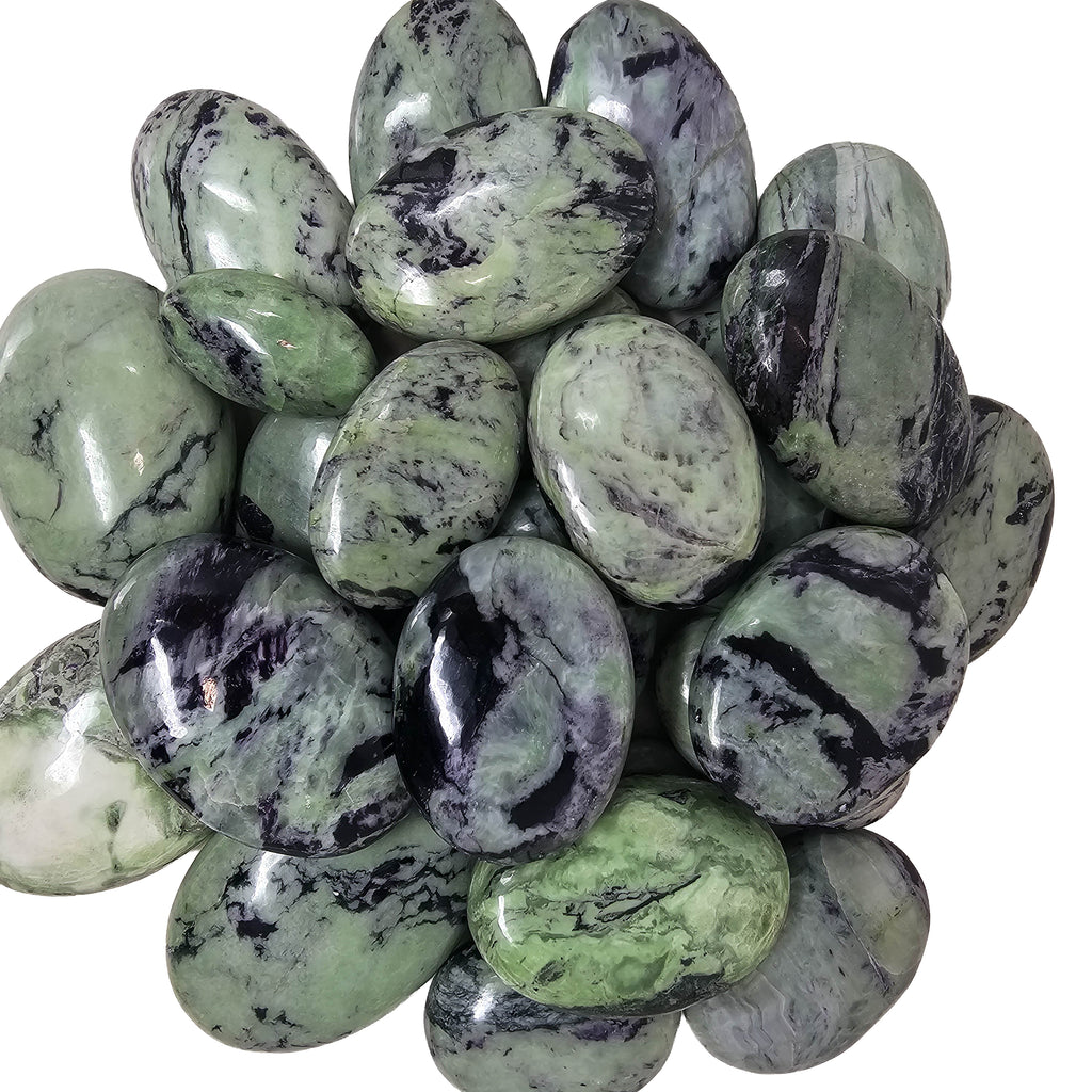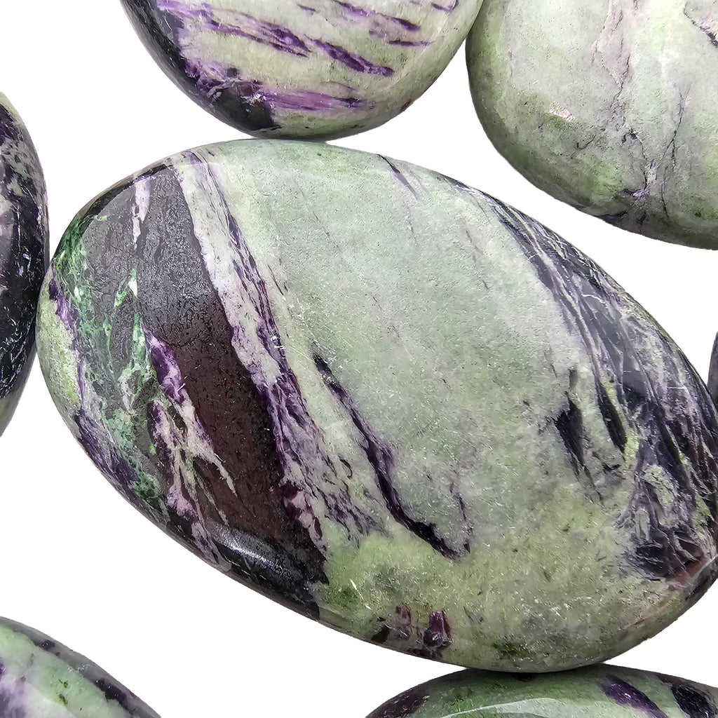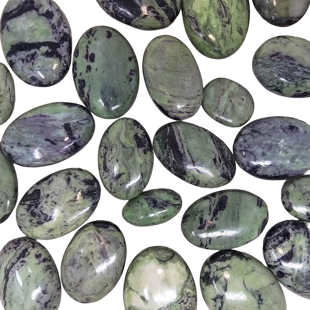 Description: Kammererite is a chromium-rich variety of clinochlore from the chlorite mineral group. These palmstones from India show a mix of purple and green tones, often with a subtle reflective shimmer caused by the mineral’s layered crystal structure. Polishing the stone into a palmstone shape highlights the natural color contrast and makes the surface smooth and comfortable to hold.