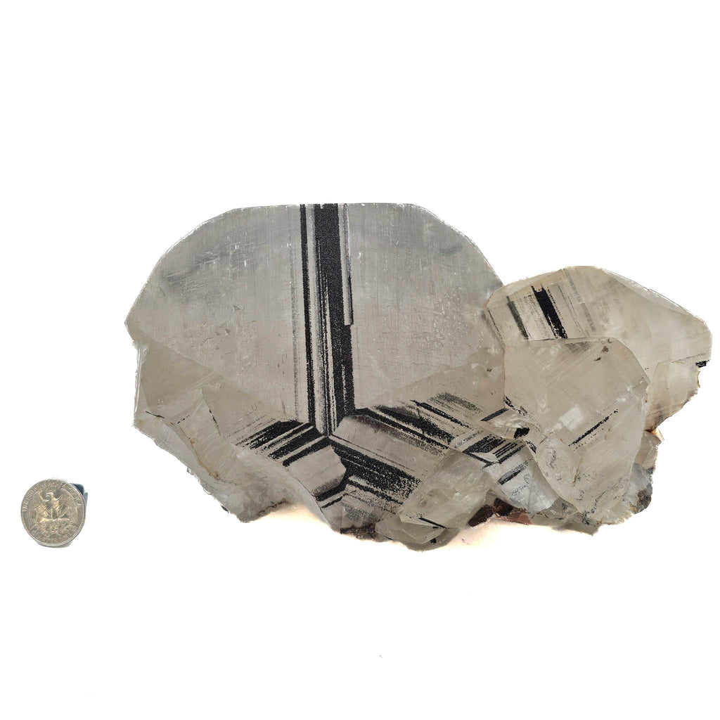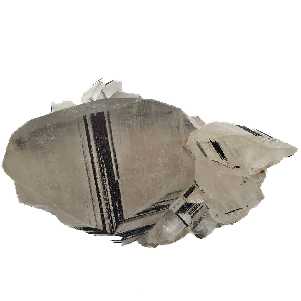 Description: This specimen features a striking, oversized Mercedes-style calcite crystal dominating the composition, with smaller companion crystals clustered along its base. The calcite is clear to slightly milky, with smooth, flattened faces that reflect light softly. What immediately stands out are the bold, sharply defined black bands running through the crystals, forming angular intersections that mirror the crystal symmetry and give the piece a highly structured, almost engineered appearance.